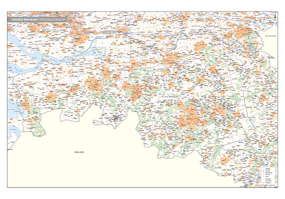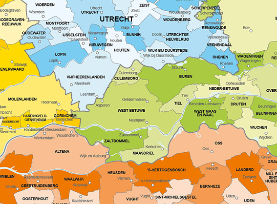 De namen van de gemeenten zijn wat groter en vetgedrukt afgebeeld. Alle gemeentekaarten zijn als wandkaart maar ook als digitale kaart verkrijgbaar. Het digitale bestand (jpeg of ai/eps) is voor intern gebruik en mag niet worden doorverkocht.