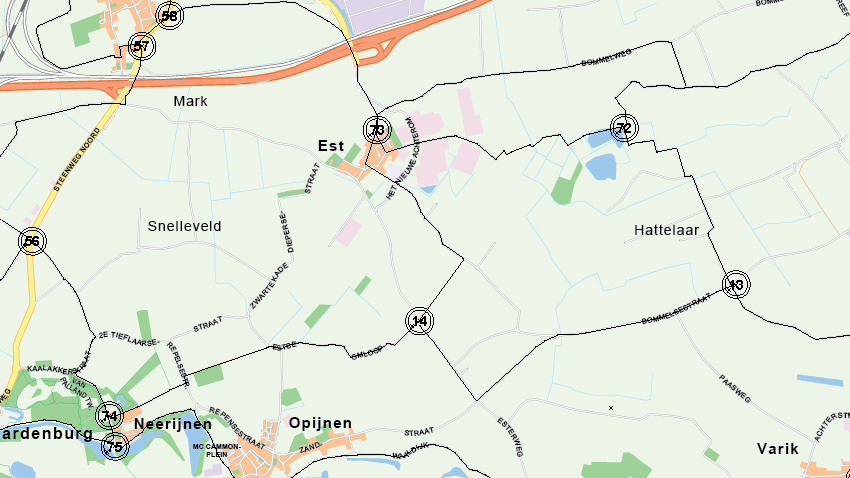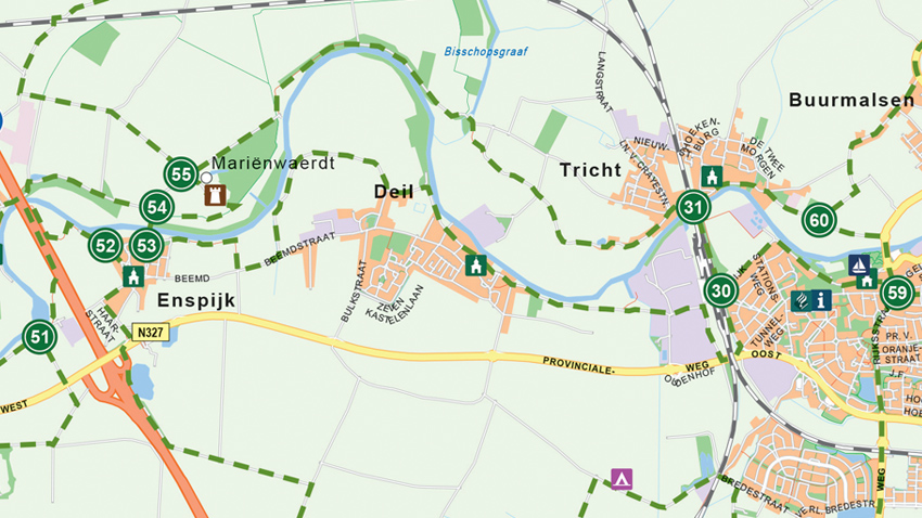 Eerder lieten we al zien dat we een aantal locaties hebben toegevoegd aan de kaart van Rivierenland. De kaart is echter nog niet compleet. We willen namelijk ook nog de landelijke fietsknooppunten (de bekende groene-witte bordjes) en de daarbij behorende fietsroutes plaatsen. Deze fiets je automatisch zodra je het Nederlandse fietsknooppuntennetwerk aanhoudt.