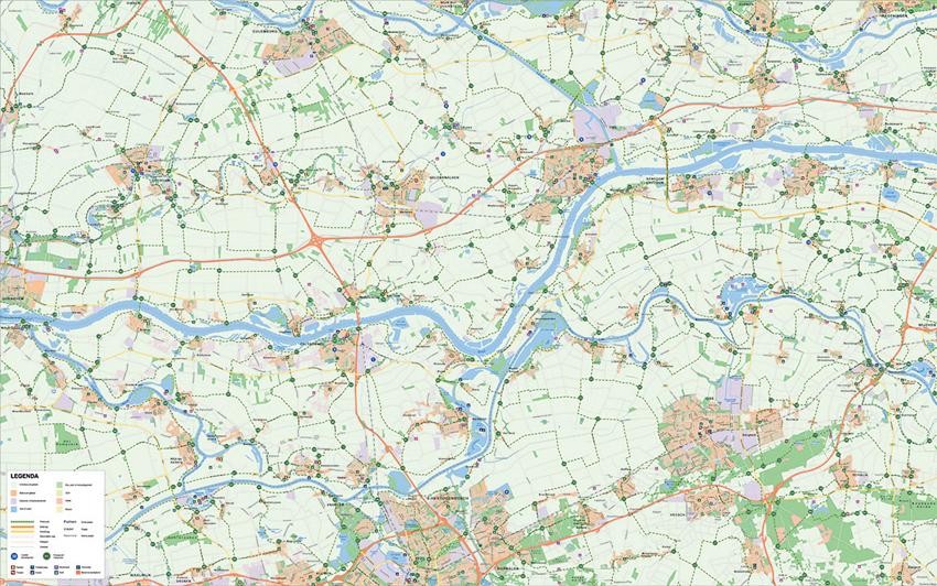 Alle nodige informatie bevindt zich nu in de kaart. We zijn klaar om de kaart een laatste keer op te maken, en deze dan ook af te ronden. De fietsroutes krijgen een vertrouwde kleur mee, herkenbaar voor de fietsers; groen als gras. Ook de knooppunten hebben een herkenbaar uiterlijk, en hebben in een mom van tijd de officiële kleuren en stijl aangenomen.