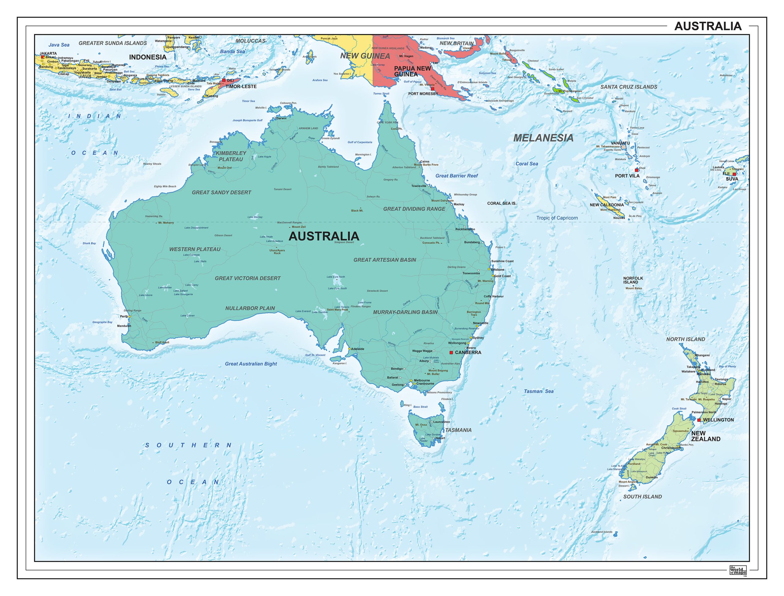 Een zeer gedetailleerde en uitgebreide staatkundige kaart van Australië. De kaart is uitgevoerd in een prachtige kleurencombinatie, heeft een eigentijdse uitstraling en is Engelstalig.