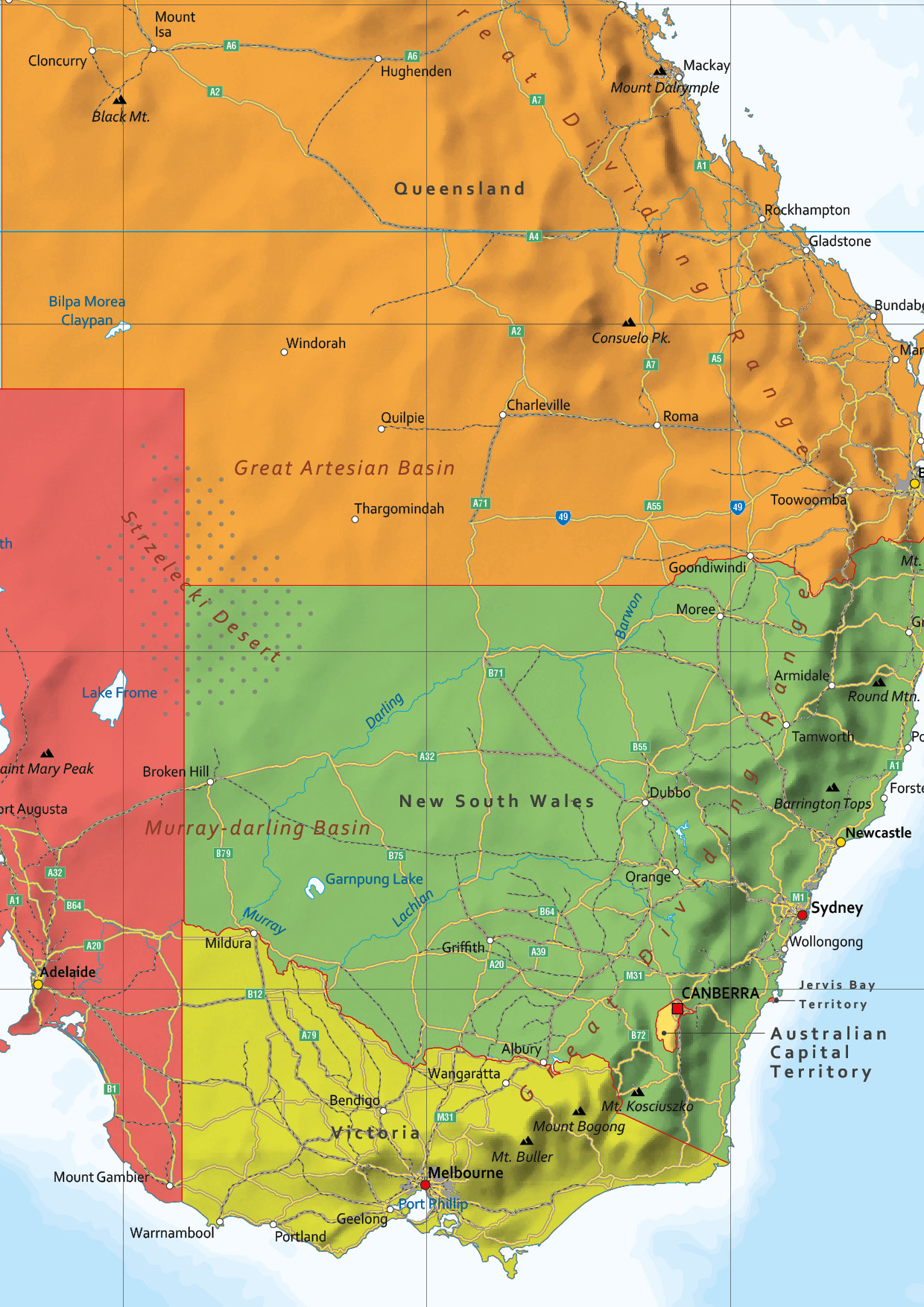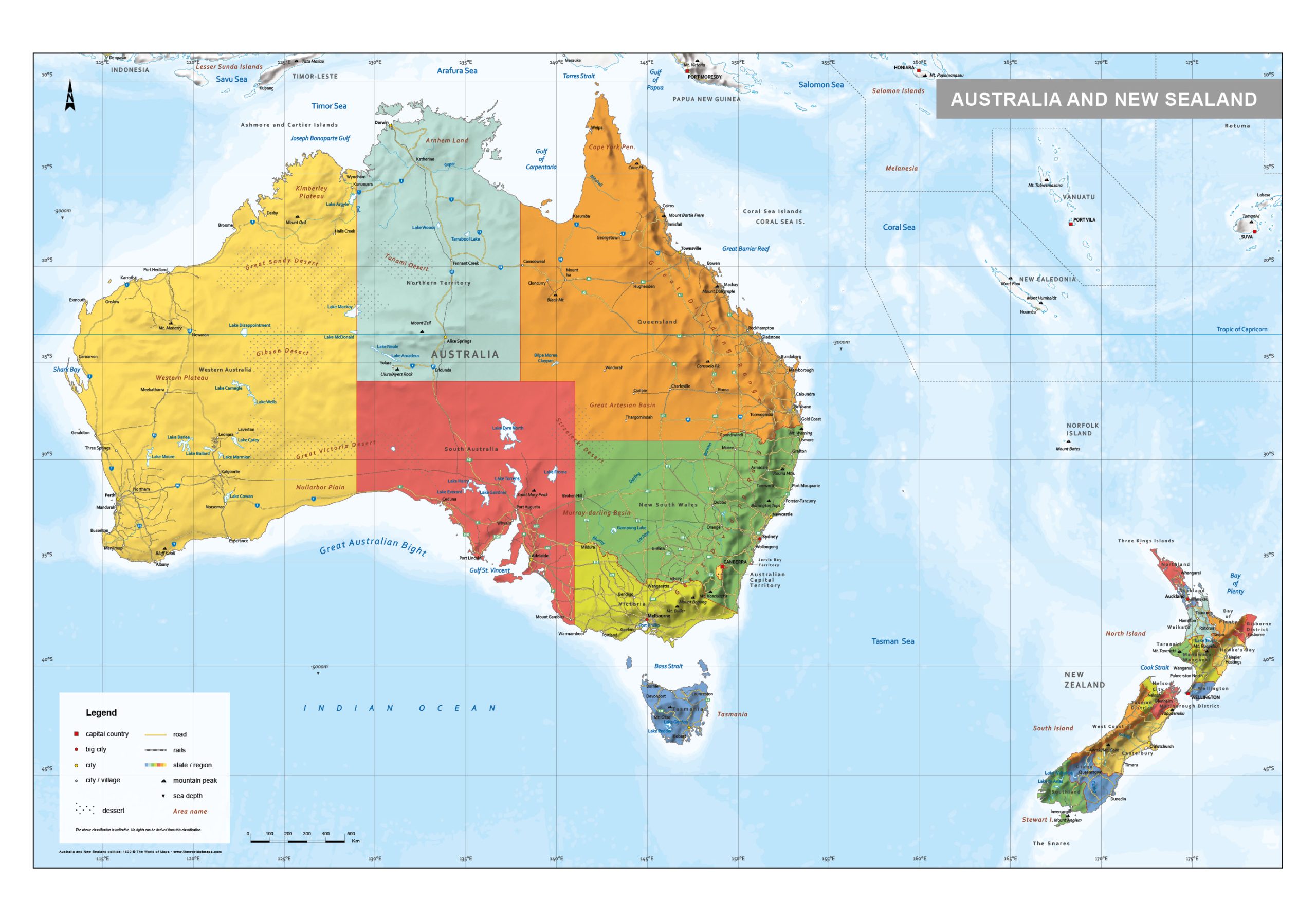 Staatkundige kaart van Australië en Nieuw-Zeeland in prachtige kleuren. Alle provincies zijn duidelijk te zien door de verschillende kleuren. De kaart laat naast de hoofdsteden ook veel grote en kleine steden en dorpen zien. Veel wegen en spoorlijnen staan op de kaart. Ook woestijnen, bergtoppen en zelfs de zeediepten worden weergegeven. Met Engelse tekst.