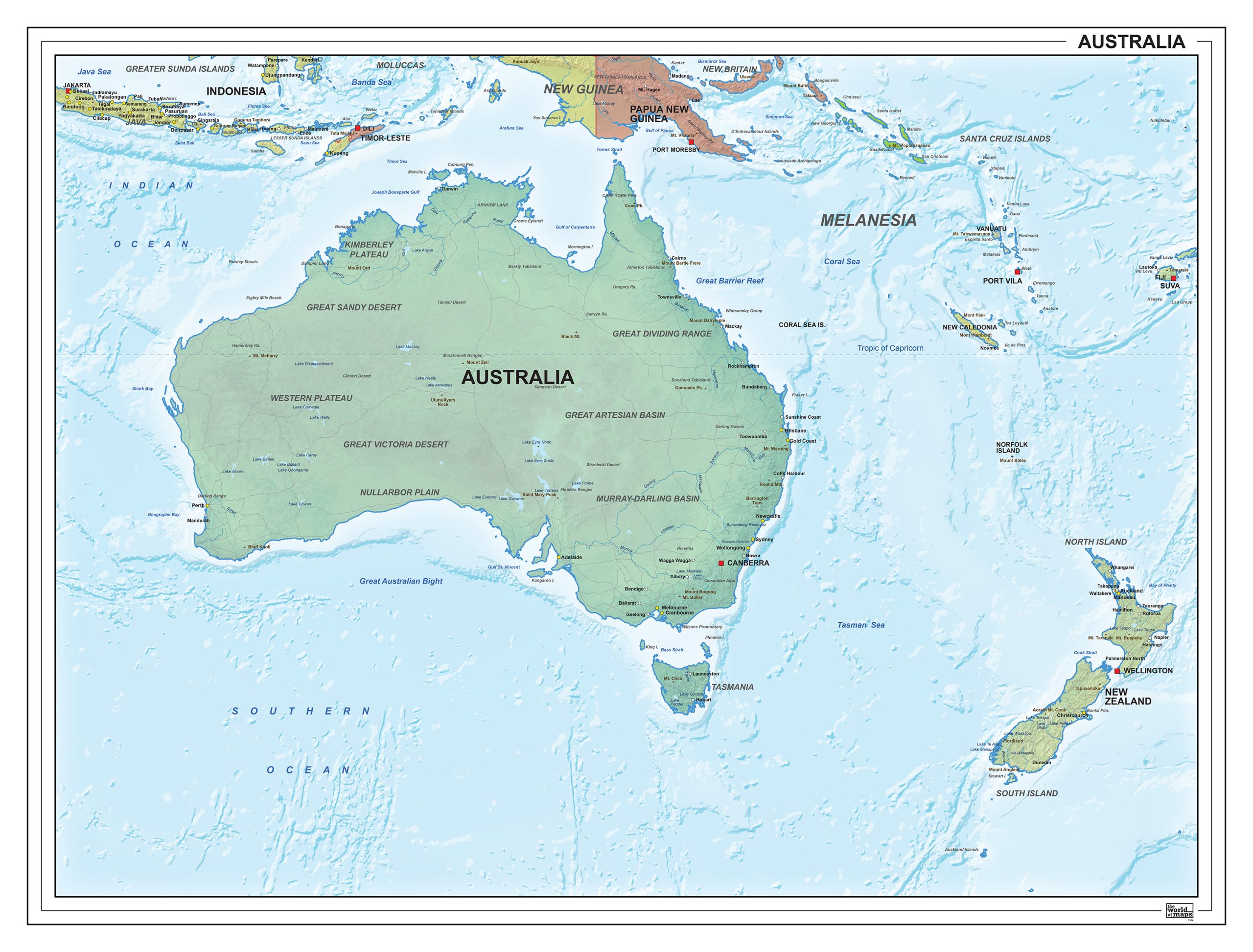 Een zeer gedetailleerde en uitgebreide staatkundige kaart van Australië met reliëf ondergrond. De kaart is uitgevoerd in een prachtige kleurencombinatie en heeft een eigentijdse uitstraling.