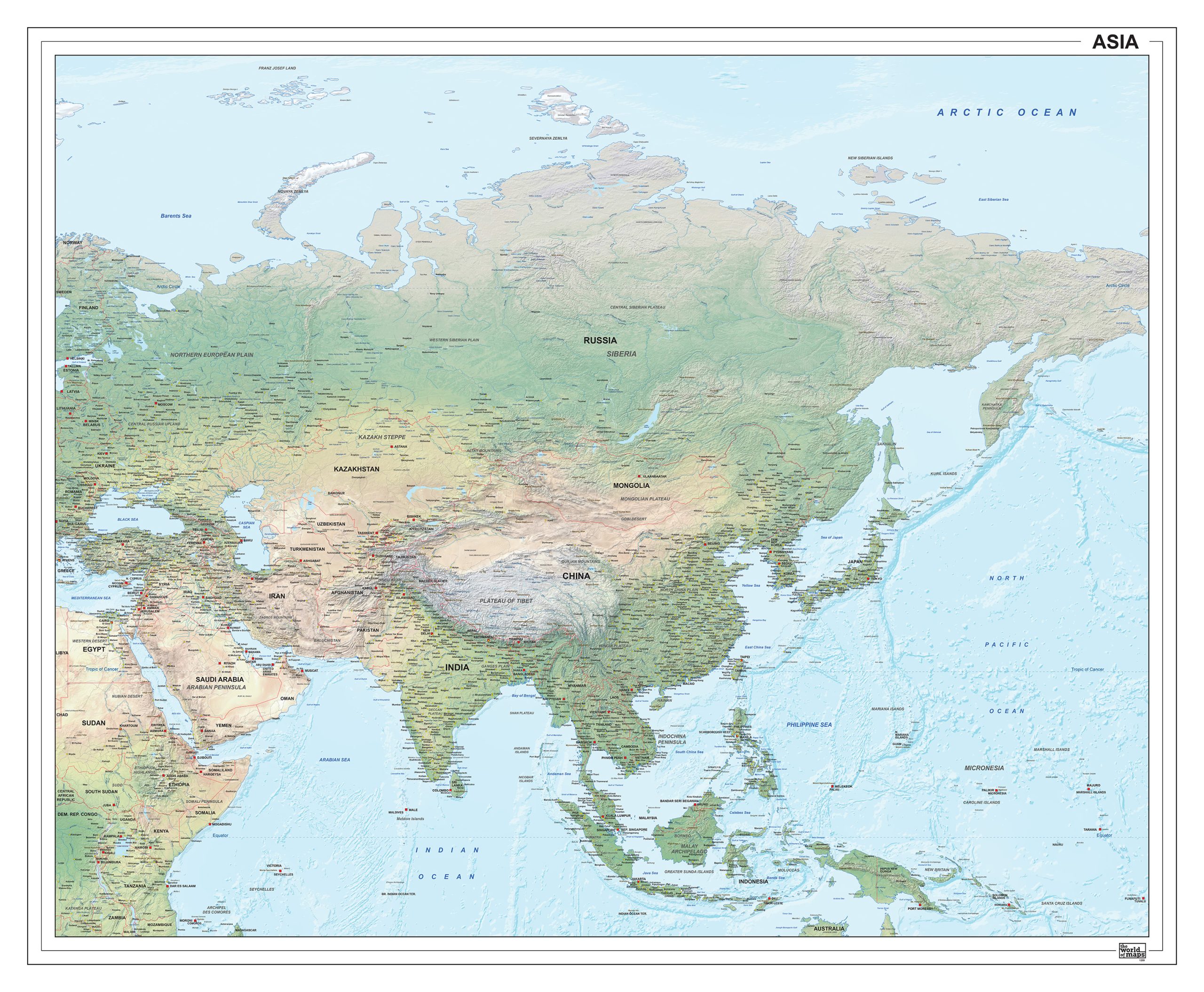 Een zeer gedetailleerde en uitgebreide natuurkundige kaart van Azië met reliëf ondergrond. De kaart is uitgevoerd in een prachtige kleurencombinatie, heeft een eigentijdse uitstraling en is Engelstalig.
