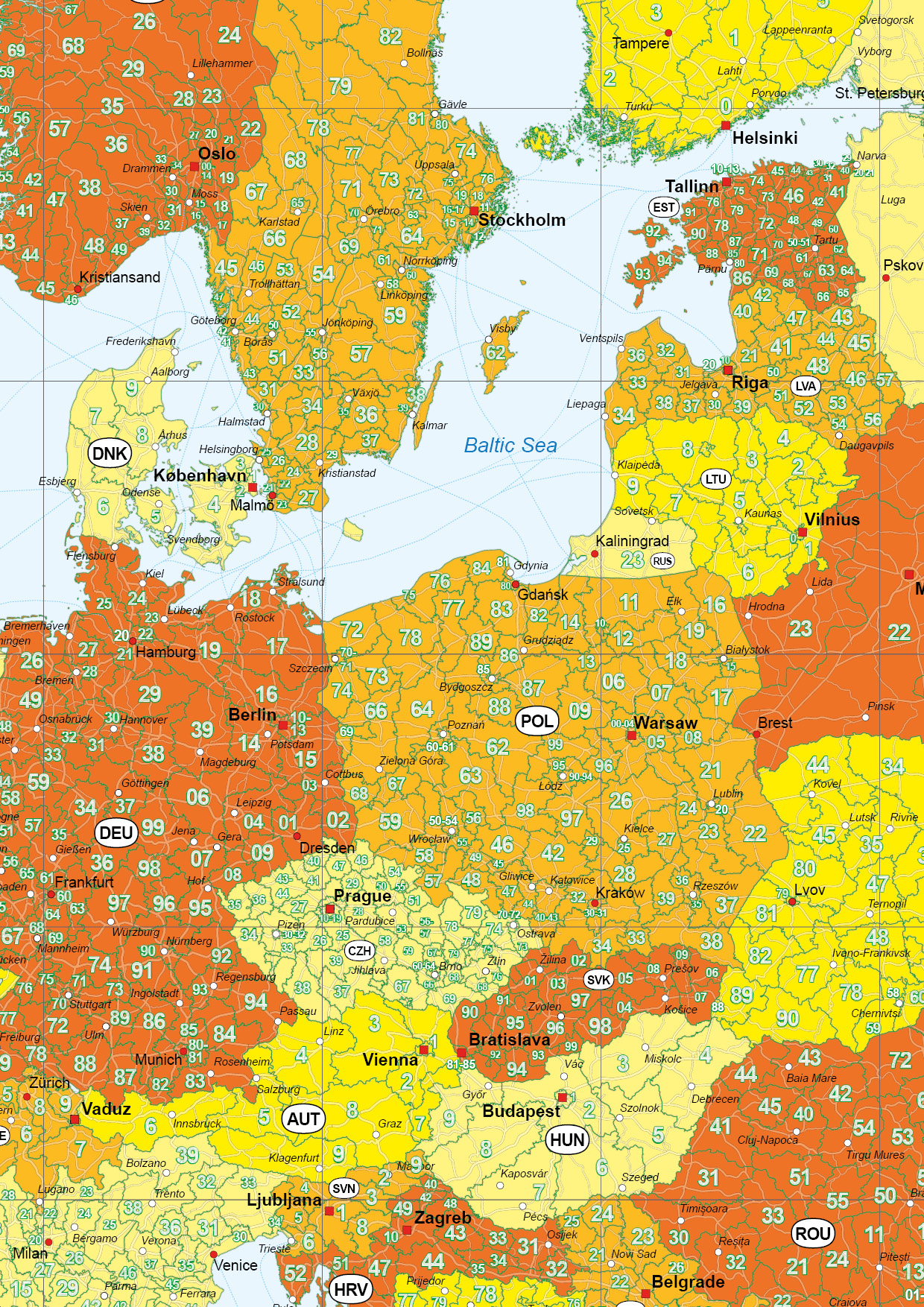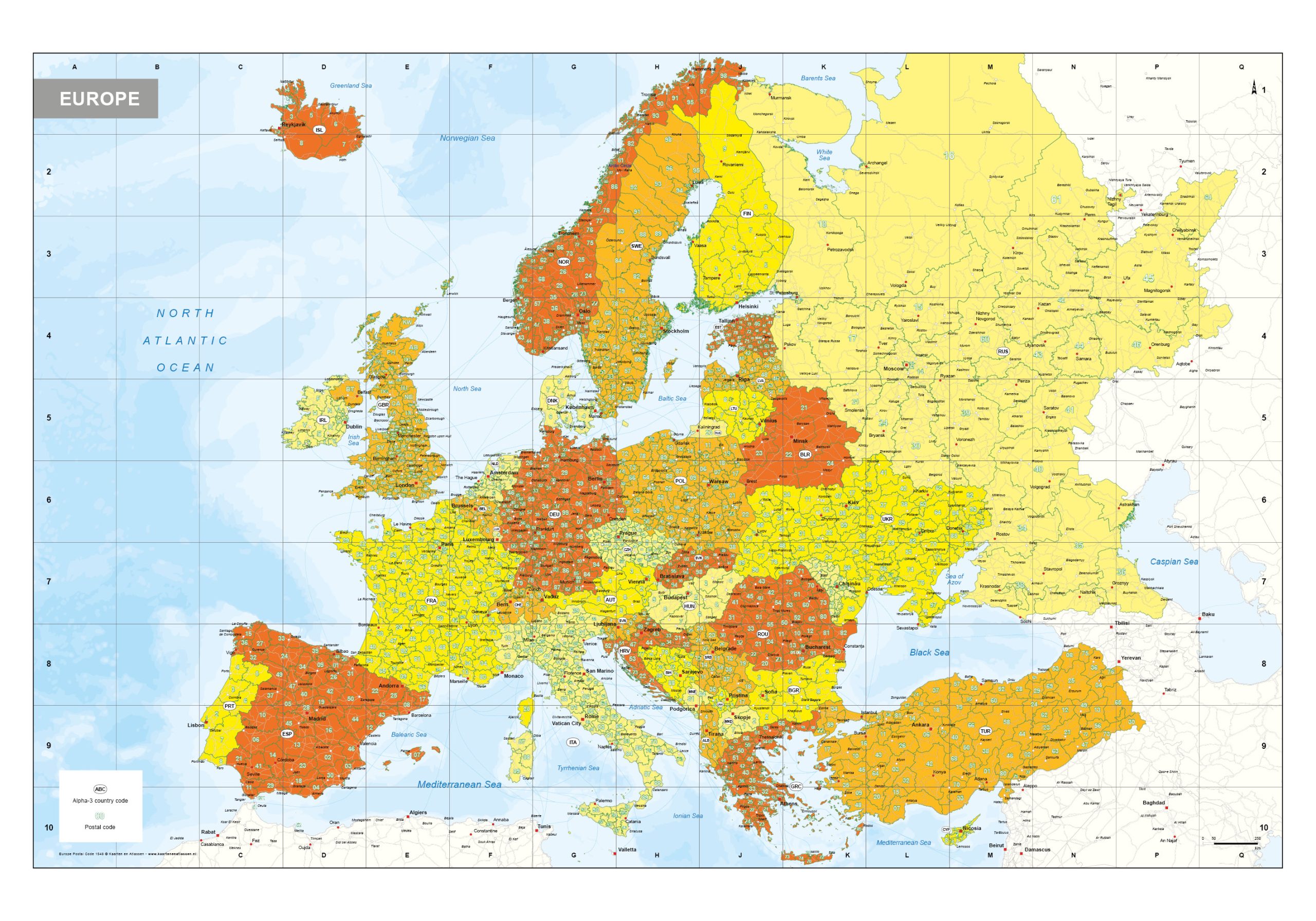 Duidelijke postcodekaart van heel Europa. De kaart toont alle landen van Europa op 2-cijferig niveau en in een enkel geval op 1-cijferig niveau. De kaart kan op ieder formaat door ons worden afgedrukt in iedere kleurstelling. Er kan aan de kaart extra informatie worden toegevoegd. Bekijk ook onze Postcodekaart van Oost-Europa 1770.