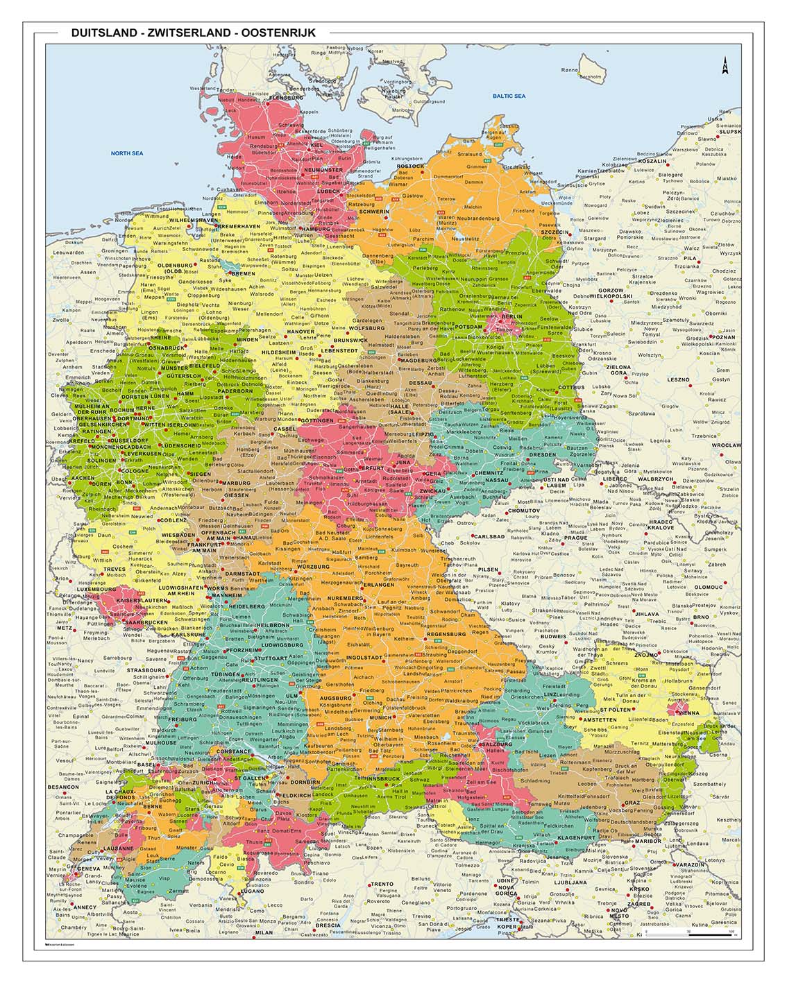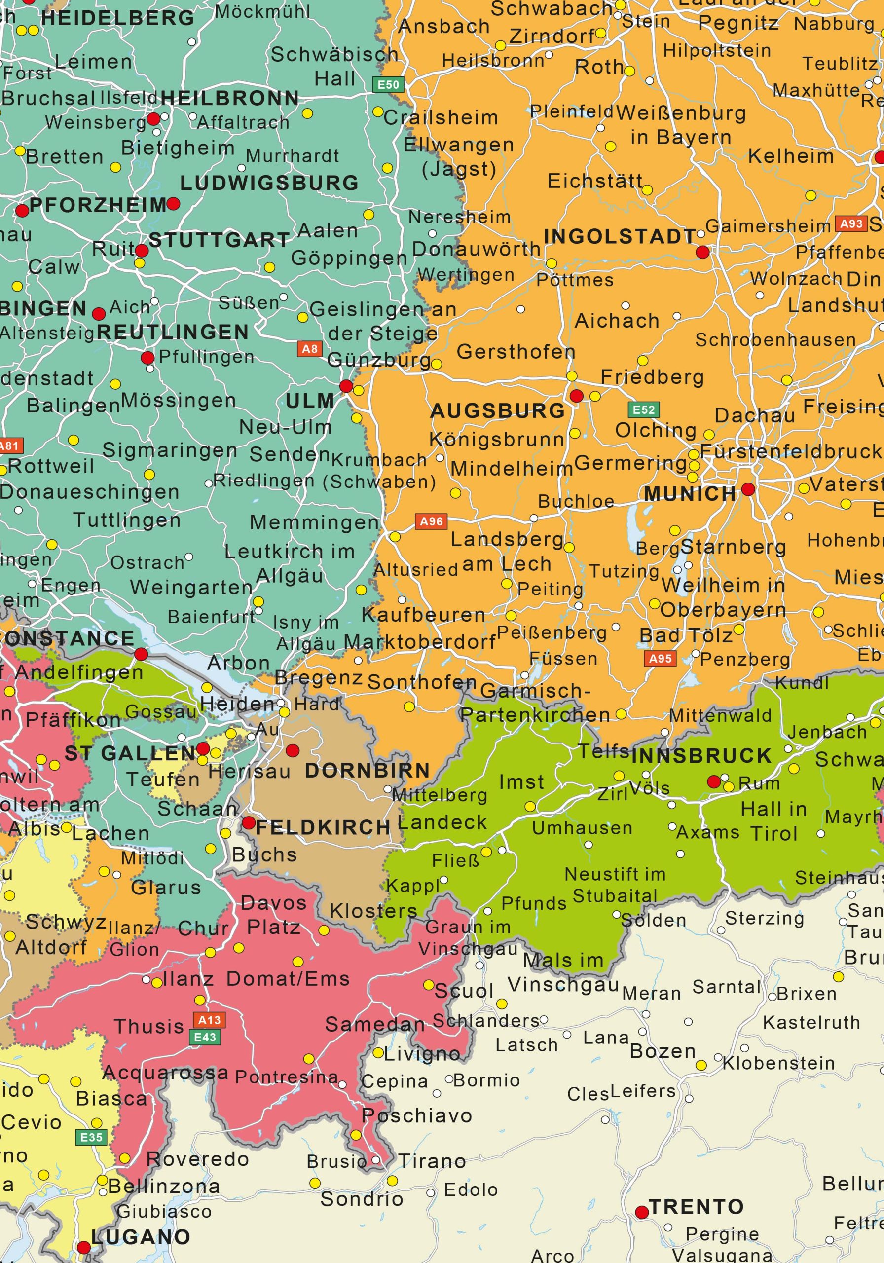 Duidelijke kaart van de tegenhanger van de Benelux; een kaart van Duitsland-Oostenrijk en Zwitserland. De snelwegen en de grotere plaatsen zijn weergegeven. Elk land en elke provincie is onderverdeeld en heeft een aparte  kleur.