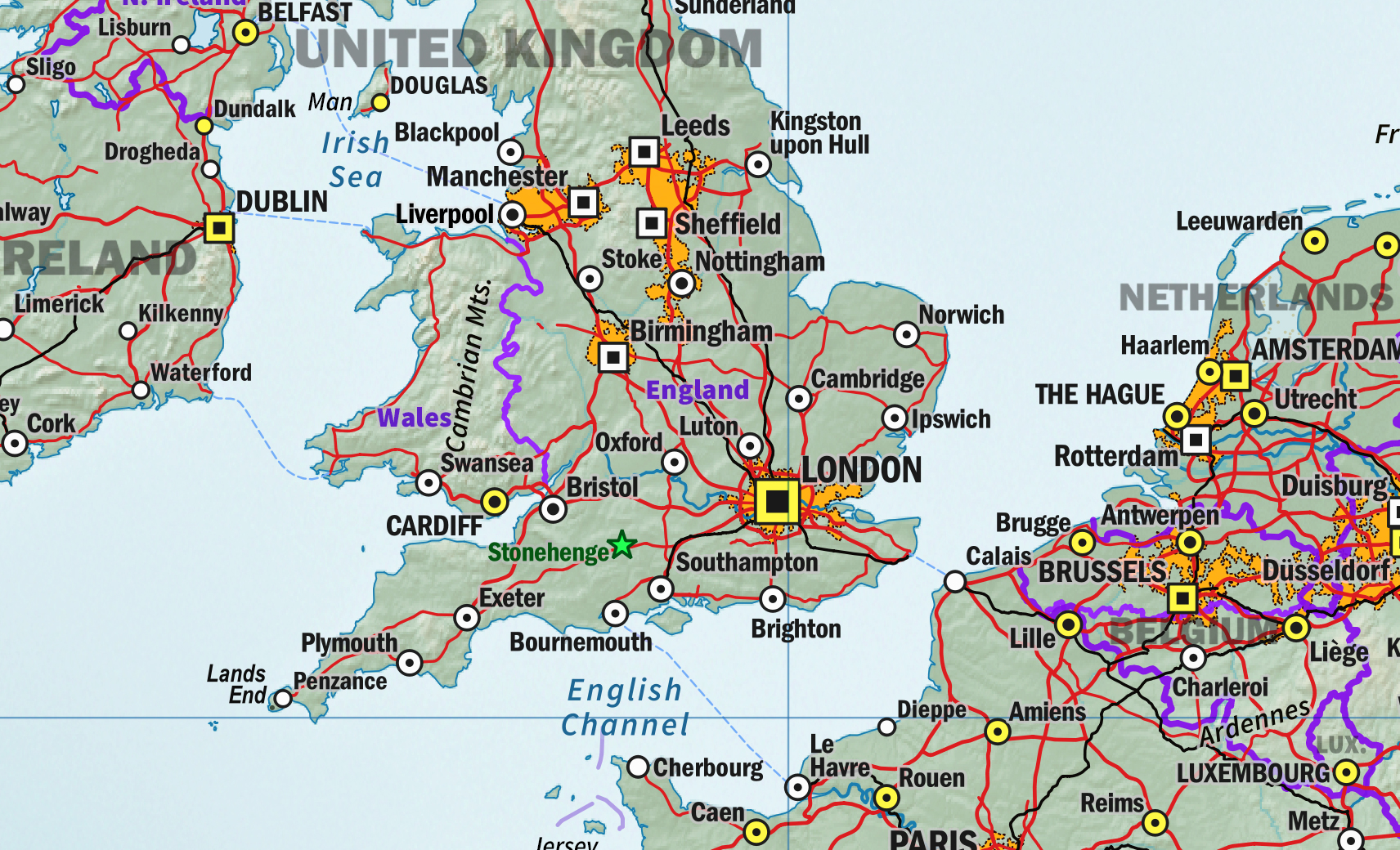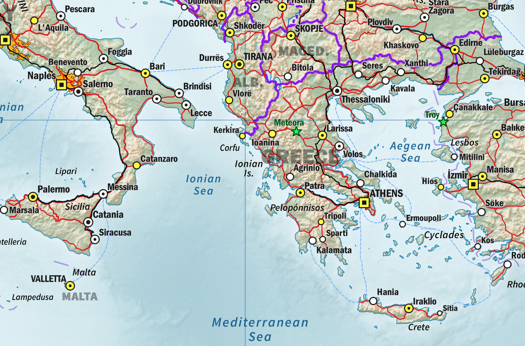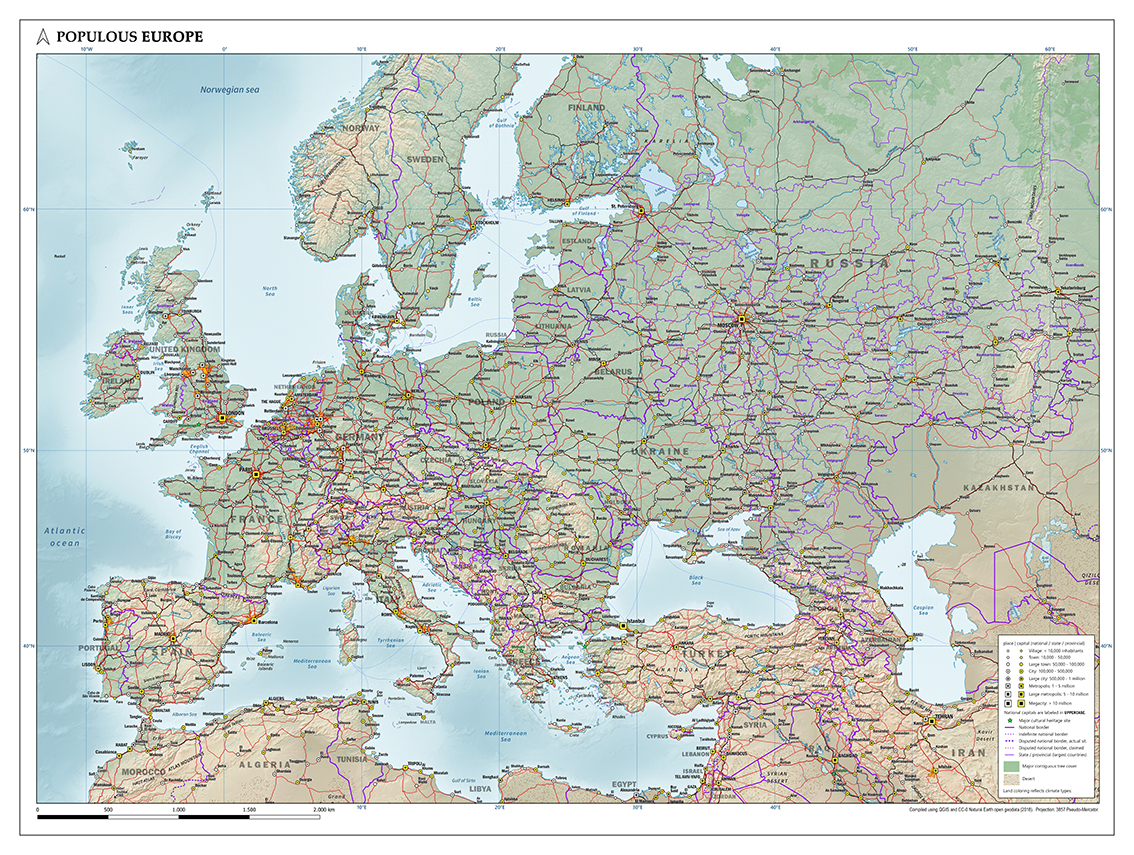 Gedetailleerde natuurkundige kaart van bijna geheel Europa. Turkije en geheel Europees Rusland zijn op de kaart afgebeeld. Het noordelijkste gedeelte van Scandinavië ontbreekt. De legenda met vooral de weergave van de steden is zeer gedetailleerd. De kaart is samengesteld uit de Natural Earth open geodata. Met Engelse tekst.