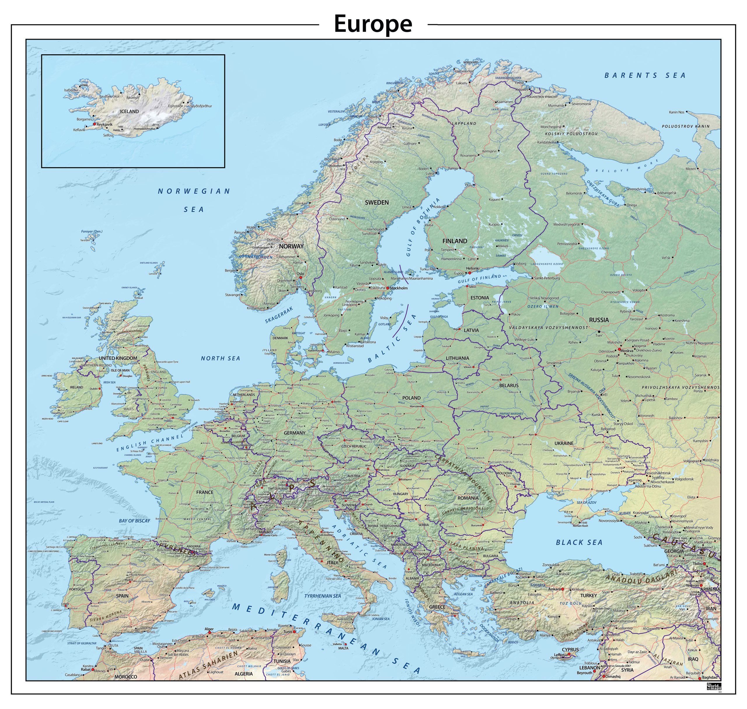 Gedetailleerde kaart van Europa met alle landen, belangrijkste steden en hoofdwegen. Met Engelse tekst.