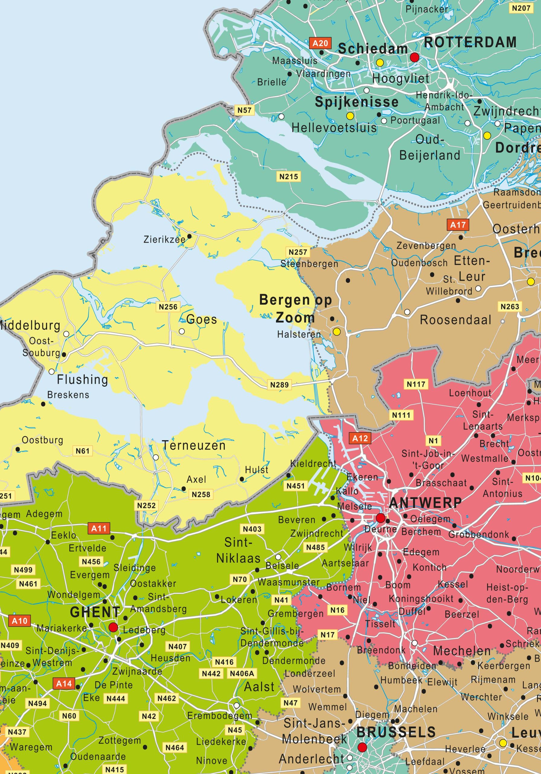 Duidelijke digitale kaart van de Benelux. De snelwegen en de grotere plaatsen zijn weergegeven. Elk land en elke provincie is onderverdeeld en heeft een aparte kleur. Kijk ook eens naar onze staatkundige en natuurkundige Benekuxkaarten.