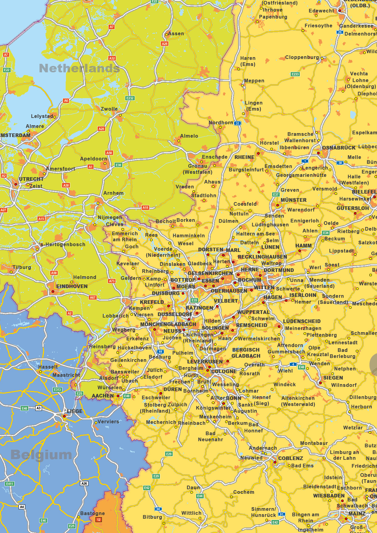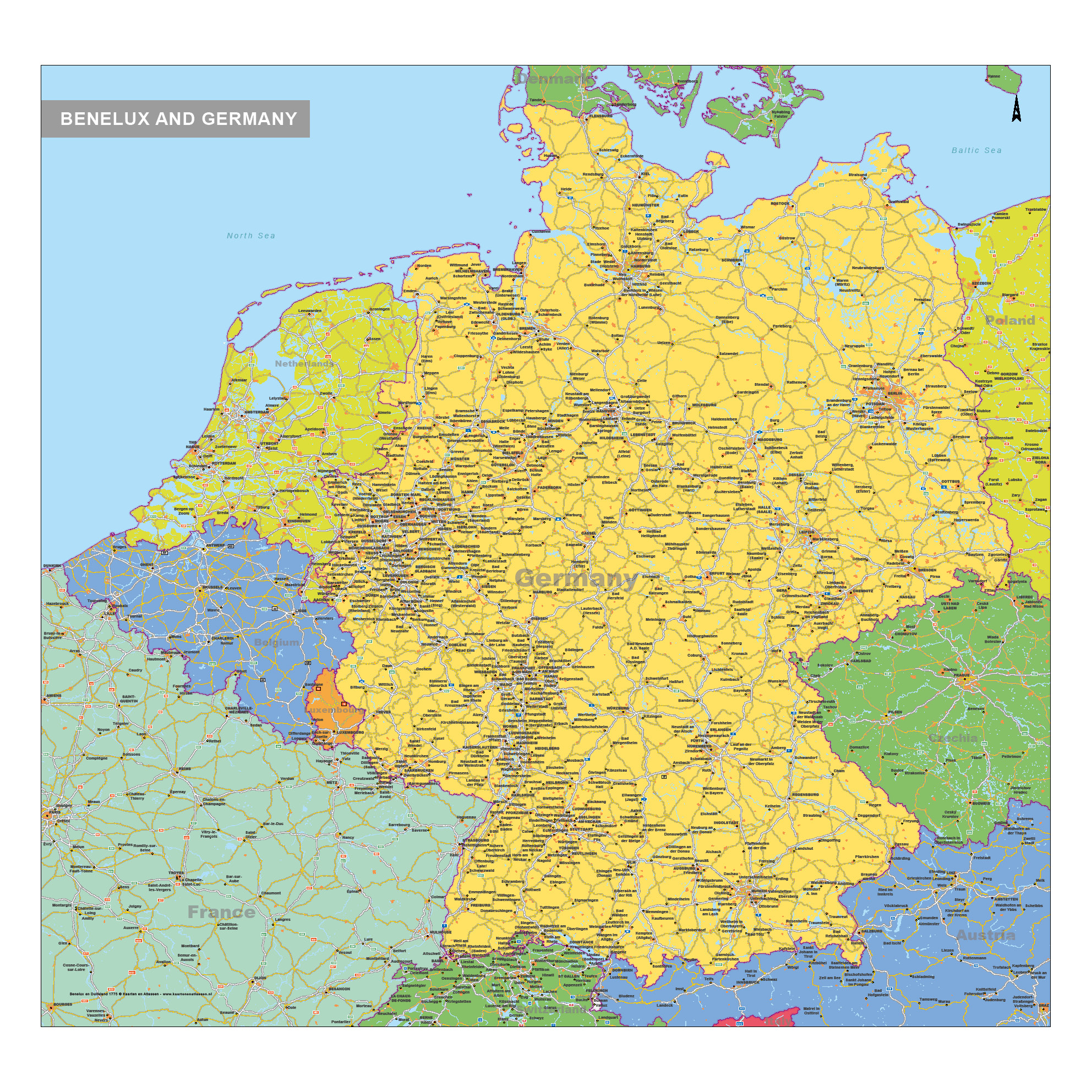 Zeer duidelijke gekleurde kaart van de Benelux en Duitsland. Op deze kaart zijn naast veel plaatsnamen ook de wegen toegevoegd. Met staatkundige ondergrond en kleur.
