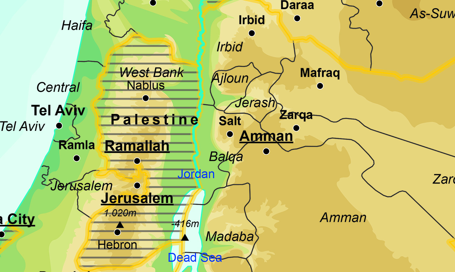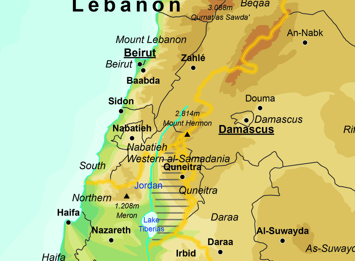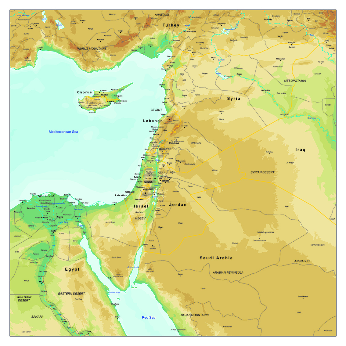 Een duidelijke natuurkundige kaart van het Midden Oosten en dan met name van Israël en omliggende landen. De kaart is uitgevoerd in een prachtige kleurencombinatie, heeft een eigentijdse uitstraling en is Engelstalig.