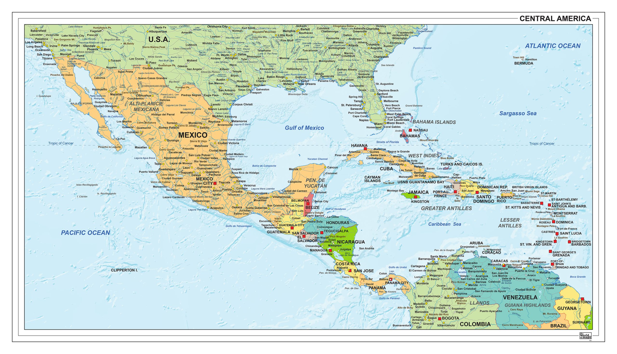 Een zeer gedetailleerde en uitgebreide staatkundige kaart van Midden-Amerika. De kaart is uitgevoerd in een prachtige kleurencombinatie, heeft een eigentijdse uitstraling en is Engelstalig.