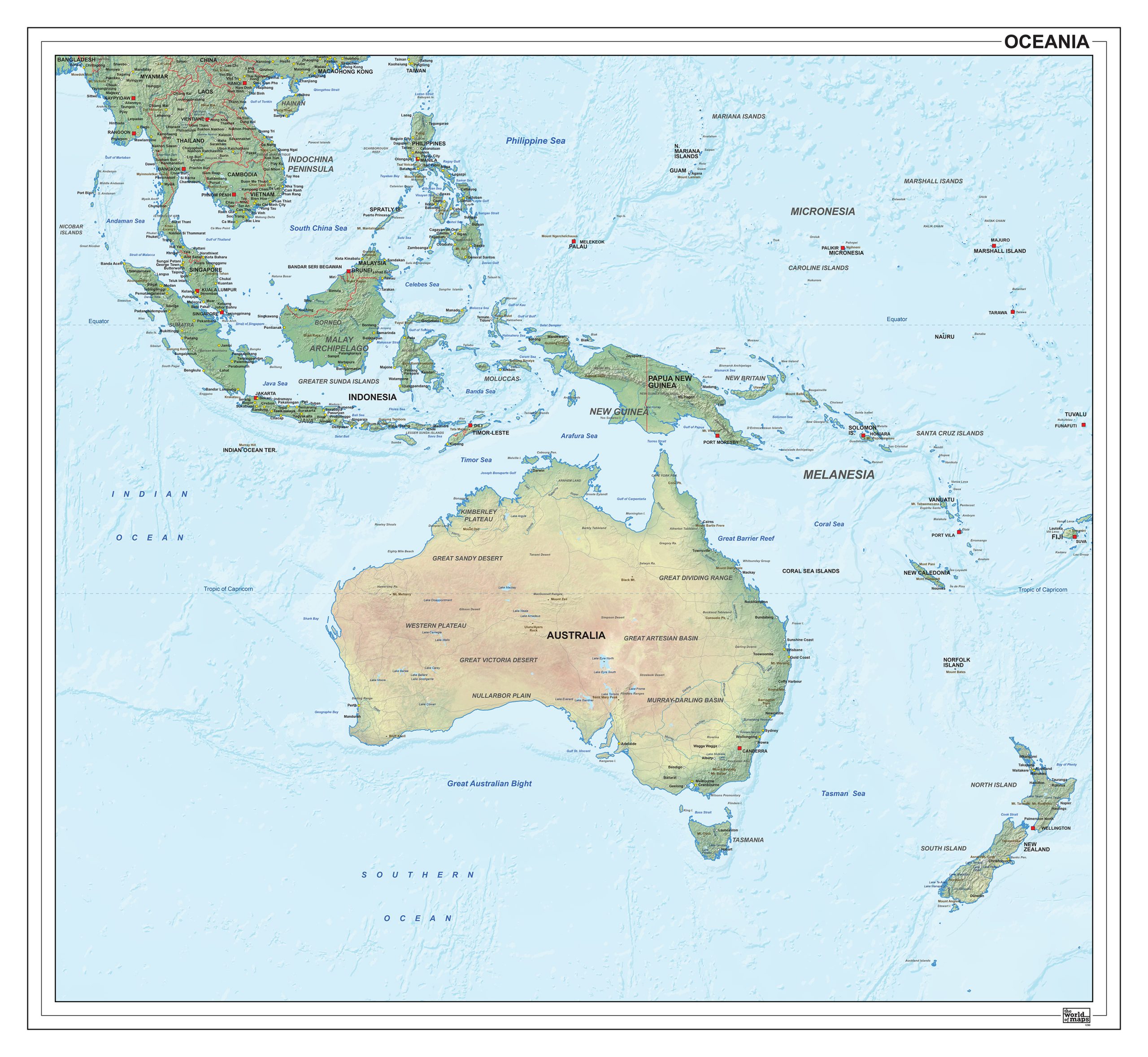 Een zeer gedetailleerde en uitgebreide natuurkundige kaart van Oceanië met reliëf ondergrond. De kaart is uitgevoerd in een prachtige kleurencombinatie, heeft een eigentijdse uitstraling en is Engelstalig.