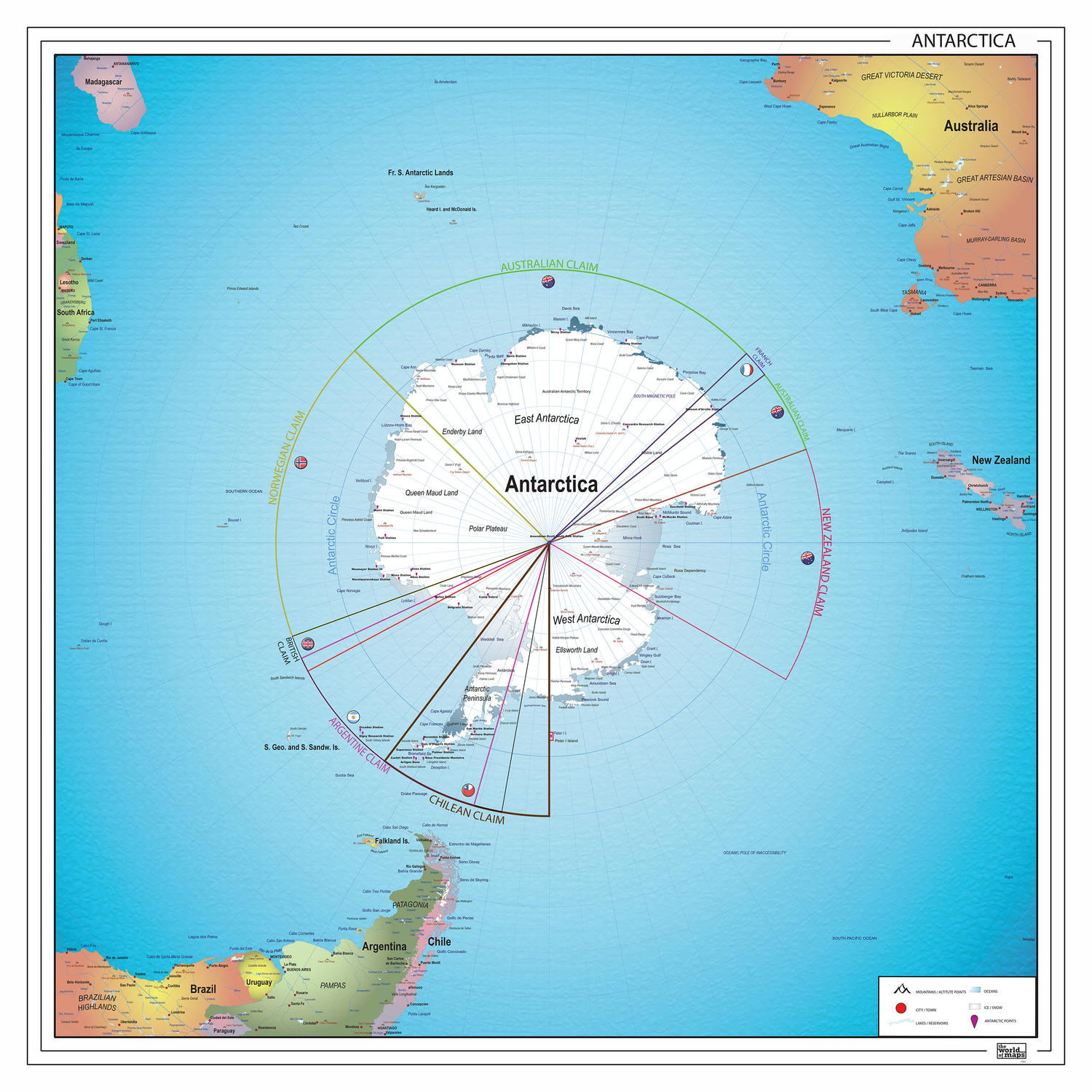 Zeer duidelijke staatkundige kaart van het Zuidpoolgebied. Engelstalig. Ook het omlioggende land is weergegeven. Op deze Kaart van de Zuidpool zijn ook alle claims en indelingen van de diverse landen weergegeven op het Antarctische continent.