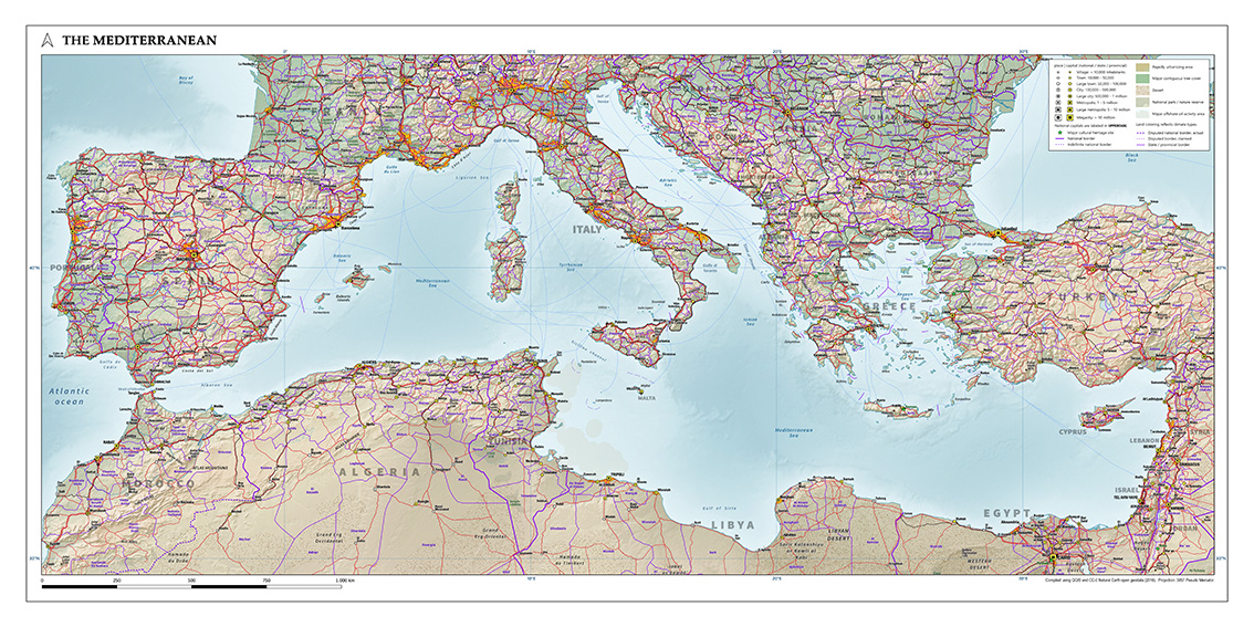 Zeer gedetailleerde natuurkundige kaart van alle landen rondom de Middellandse Zee. De legenda met vooral de weergave van de steden is zeer gedetailleerd. De kaart is samengesteld uit de Natural Earth open geodata. Met Engelse tekst.