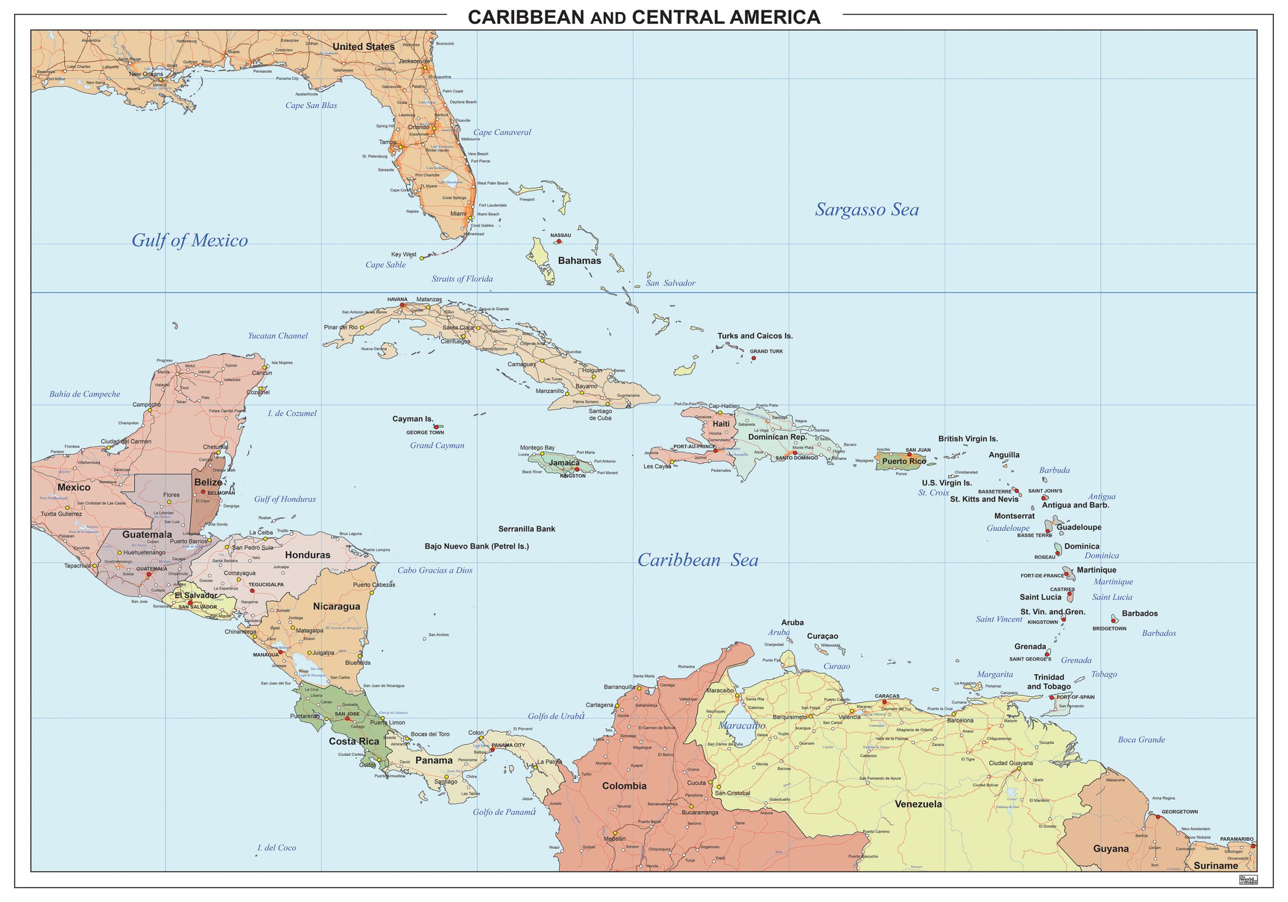 Gedetailleerde kaart van Midden-Amerika met alle landen, belangrijkste steden en hoofdwegen. Ook het gehele Caraïbische gebied is afgebeeld. Met Engelse tekst.