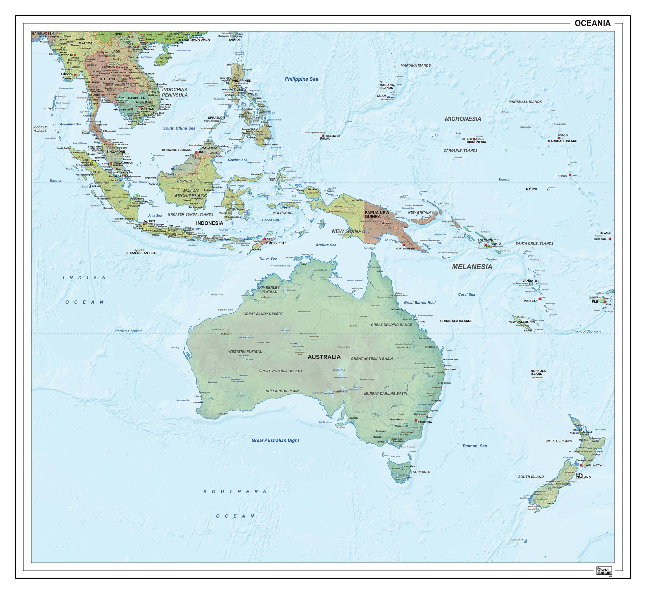 Een zeer gedetailleerde en uitgebreide staatkundige kaart van Oceanië met reliëf ondergrond. De kaart is uitgevoerd in een prachtige kleurencombinatie, heeft een eigentijdse uitstraling en is Engelstalig.