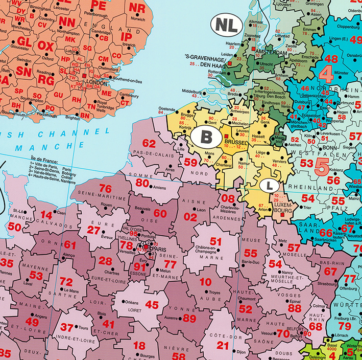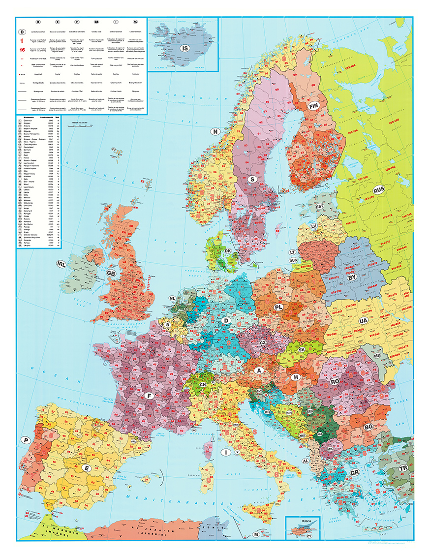 Zeer uitgebreide 2-cijferige / 2-letterige postcodekaart van Europa met diverse overzichtstabellen. Toont naast de postcodes ook het wegennet en landsymbolen.