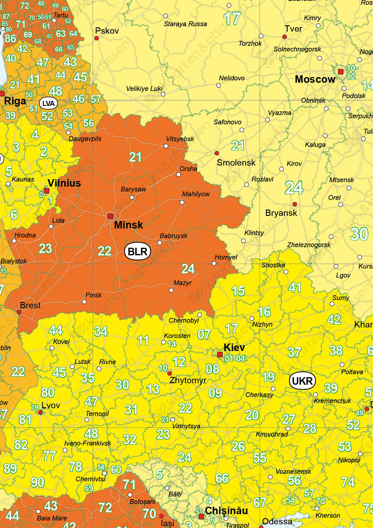 Duidelijke postcodekaart van Oost-Europa. De kaart toont alle landen van Oostelijk Europa op 2-cijferig niveau en in een enkel geval op 1-cijferig niveau. De kaart kan op ieder formaat door ons worden afgedrukt in iedere kleurstelling. Er kan aan de kaart extra informatie worden toegevoegd. Bekijk ook onze Postcodekaart van compleet Europa 1548.