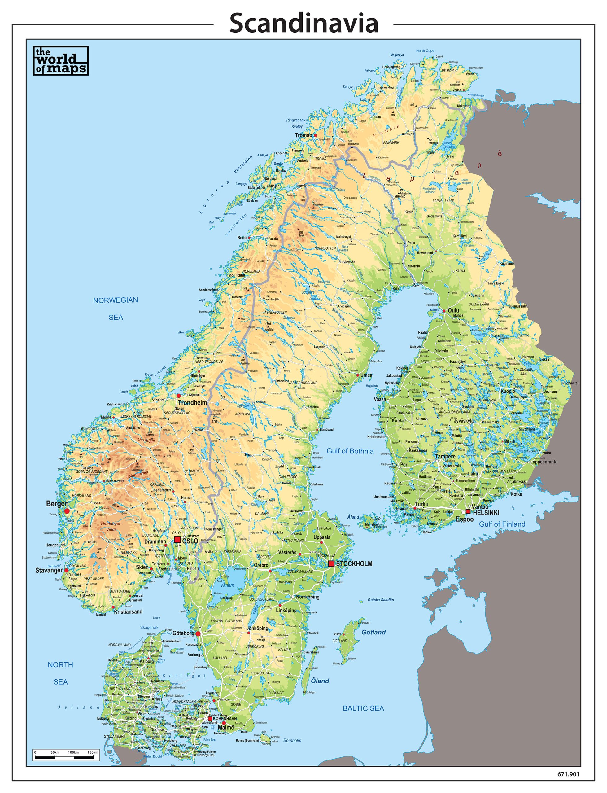 • Natuurkundige kaart van Noorwegen, Zweden, Finland en Denemarken