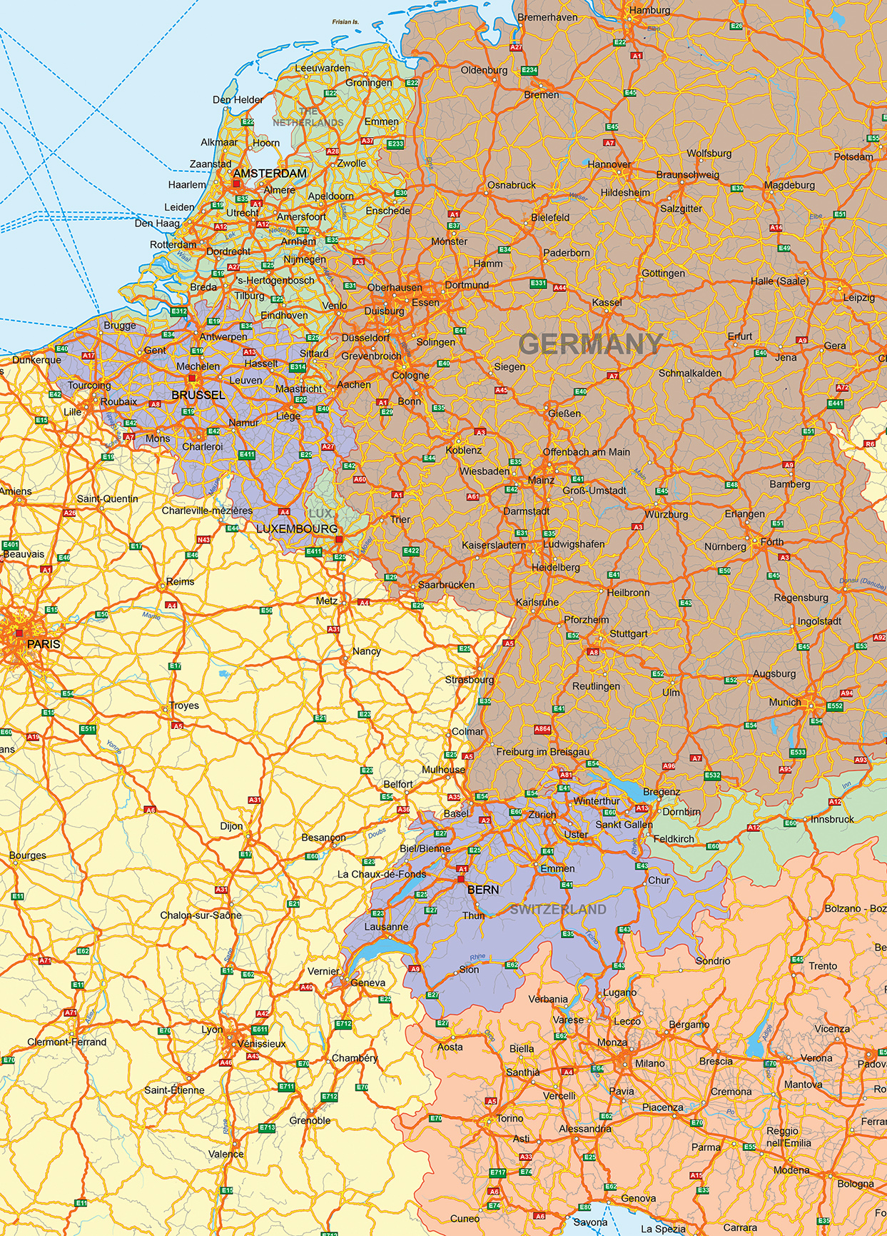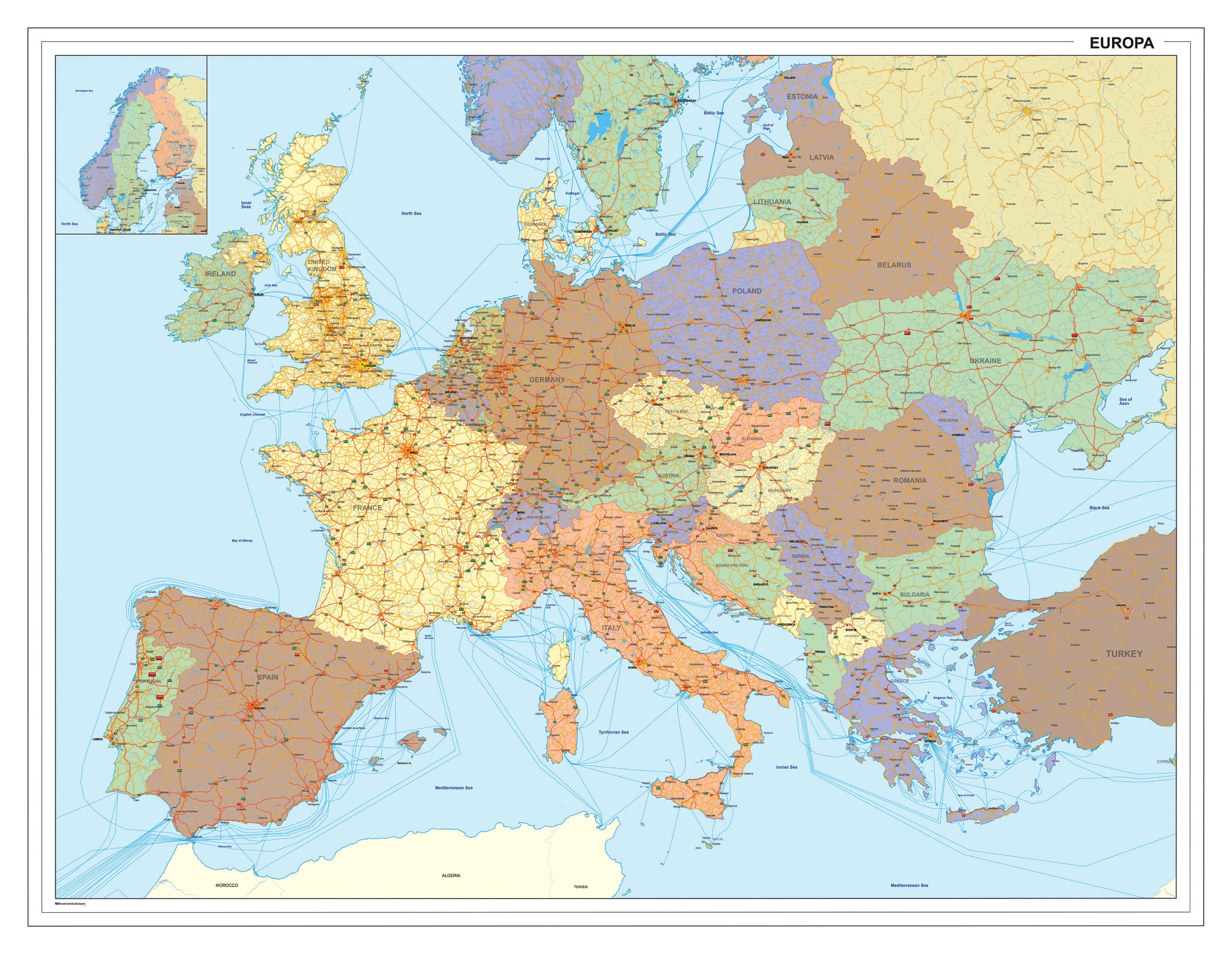 Duidelijke kaart van Europa met alle landen, hoofdsteden, grotere steden, wateren en rivieren. Op de kaart zijn ook alle snelwegen afgebeeld met snelweg nummer, ook de N-wegen worden getoond.