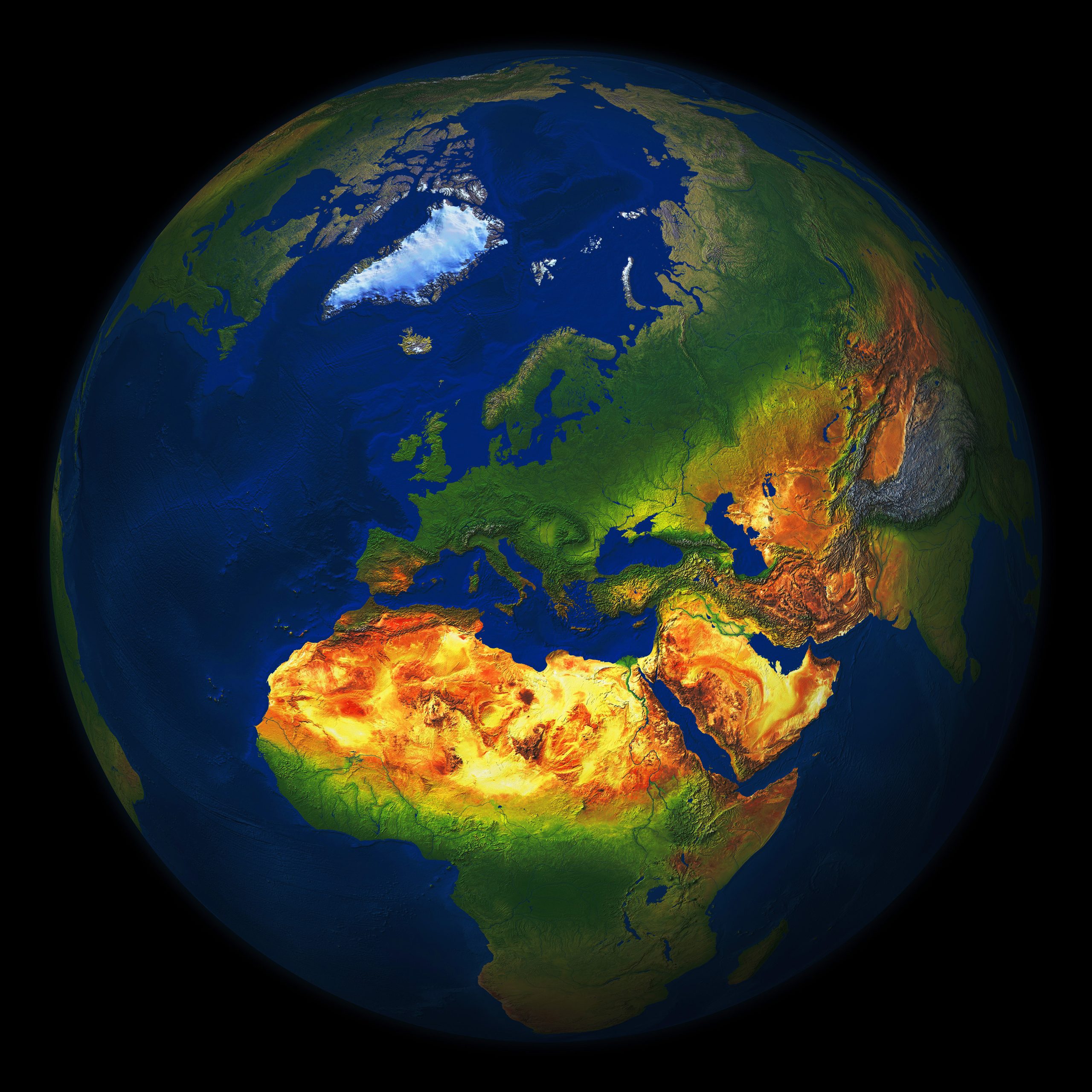 • Een bewerkte afbeelding van de wereldbol in prachtige kleuren waarin Europa centraal staat