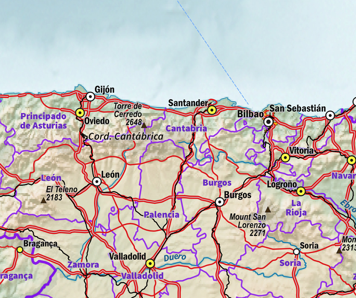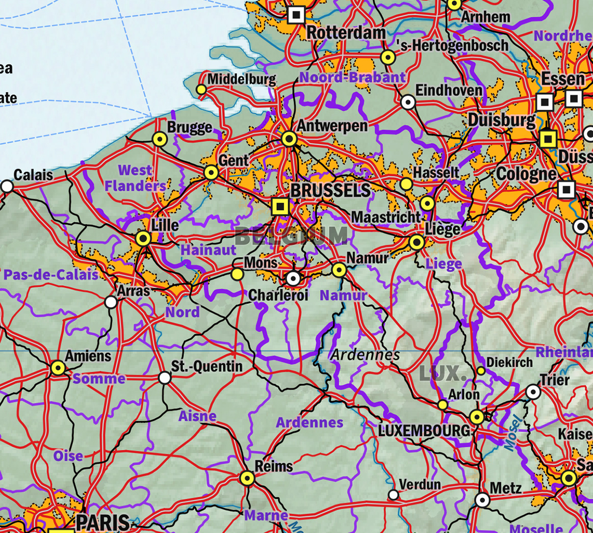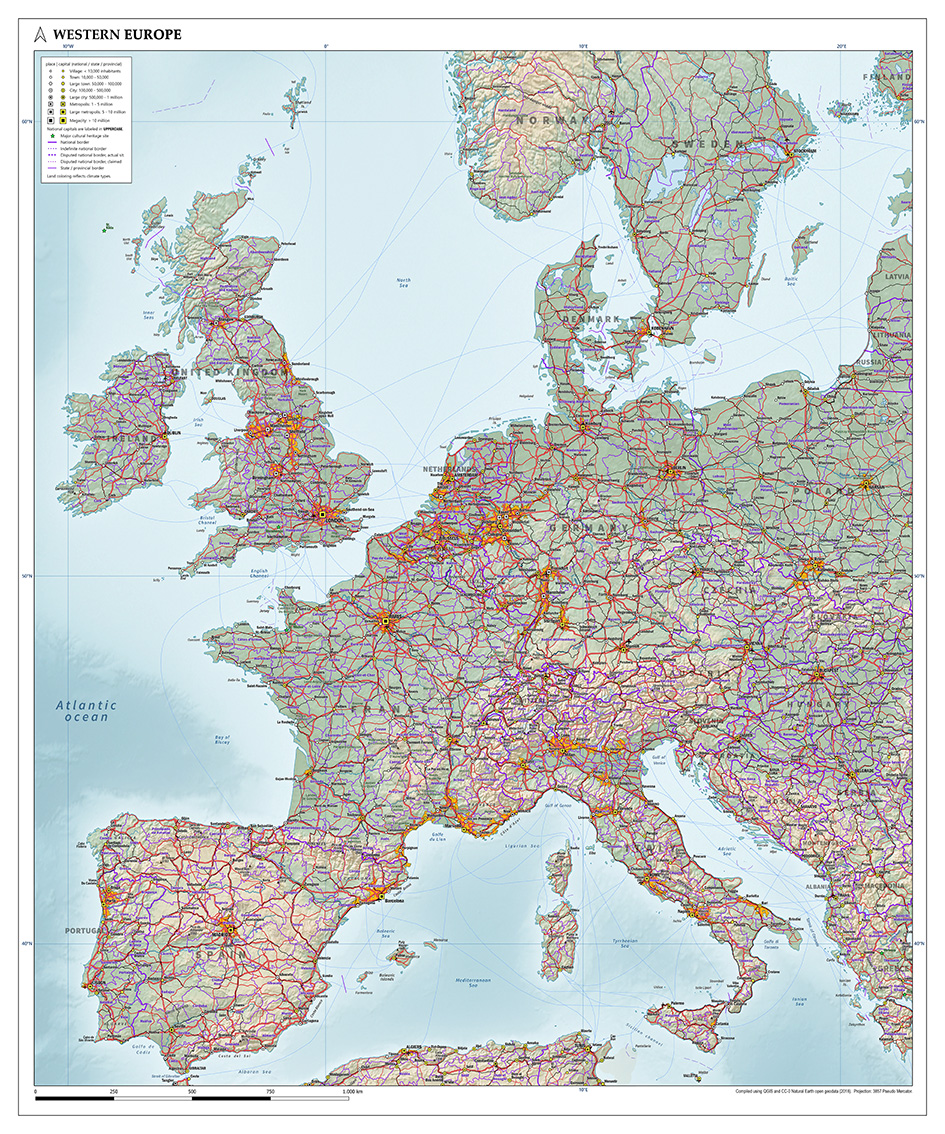 Zeer gedetailleerde natuurkundige kaart van West-Europa met het zuidelijk gedeelte van Scandinavië. De legenda met vooral de weergave van de steden is zeer gedetailleerd. De kaart is samengesteld uit de Natural Earth open geodata. Met Engelse tekst.