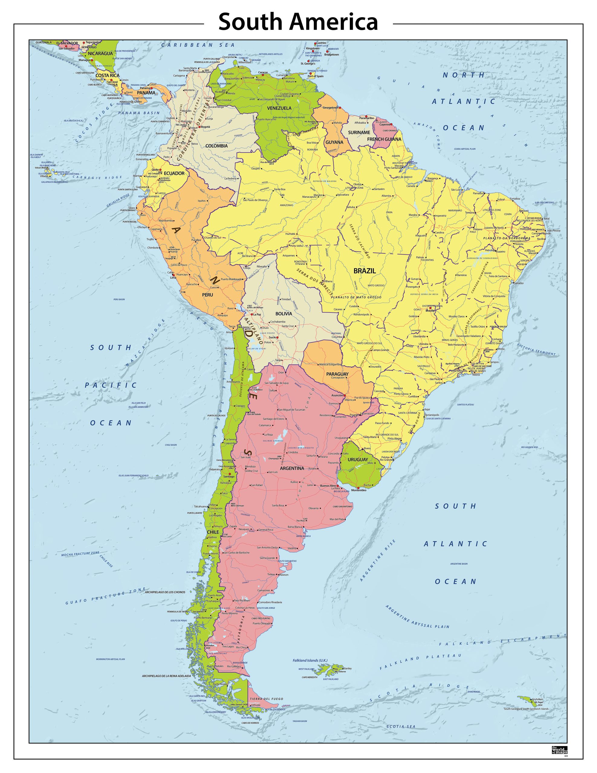 Gedetailleerde kaart van Zuid Amerika met alle landen, belangrijkste steden en hoofdwegen. Met Engelse tekst.