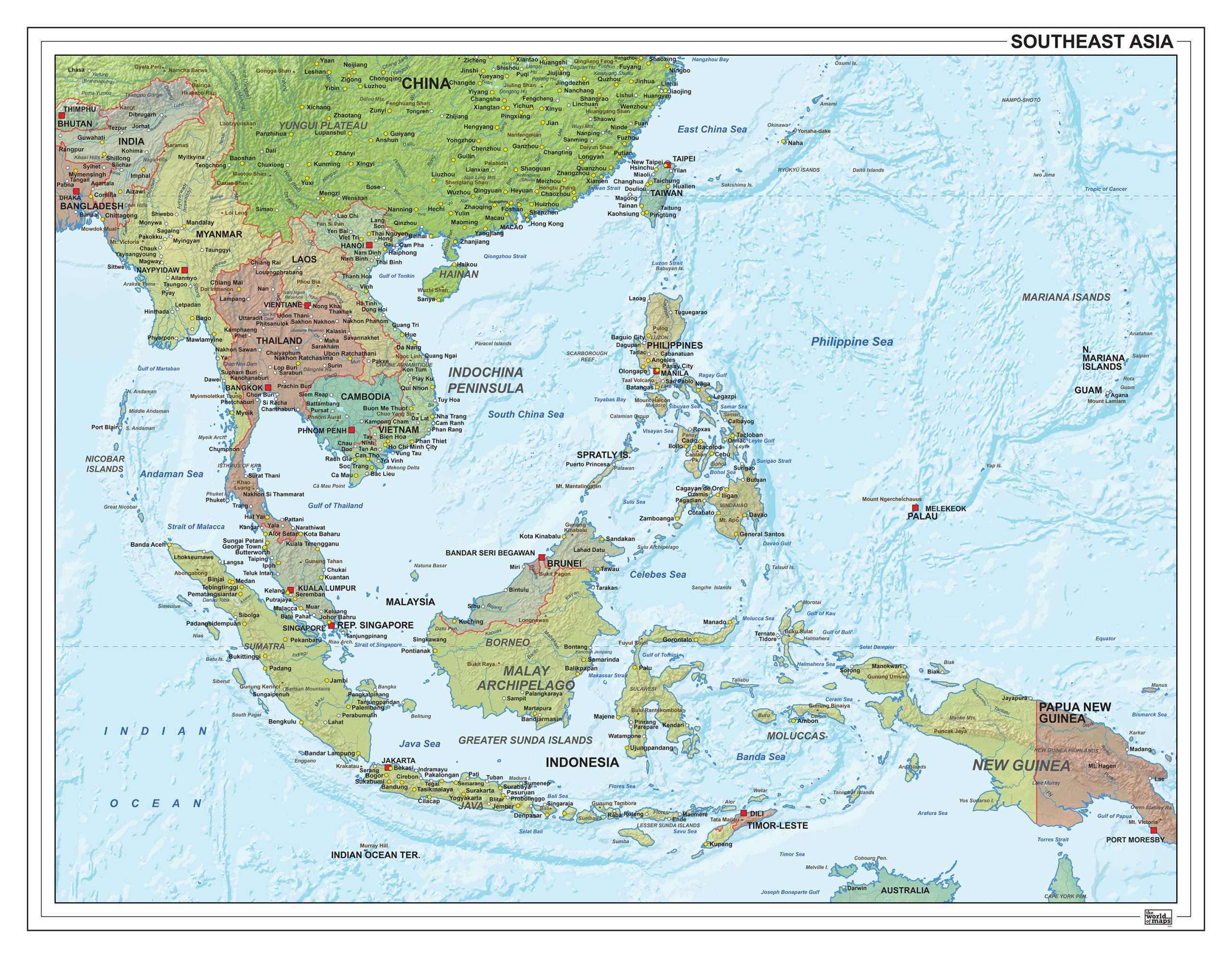 Een zeer gedetailleerde en uitgebreide staatkundige kaart van Zuid Azië met reliëf ondergrond. De kaart is uitgevoerd in een prachtige kleurencombinatie, heeft een eigentijdse uitstraling en is Engelstalig.