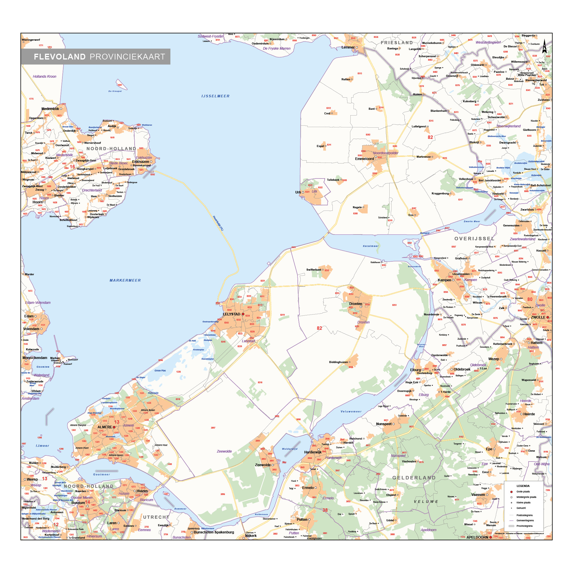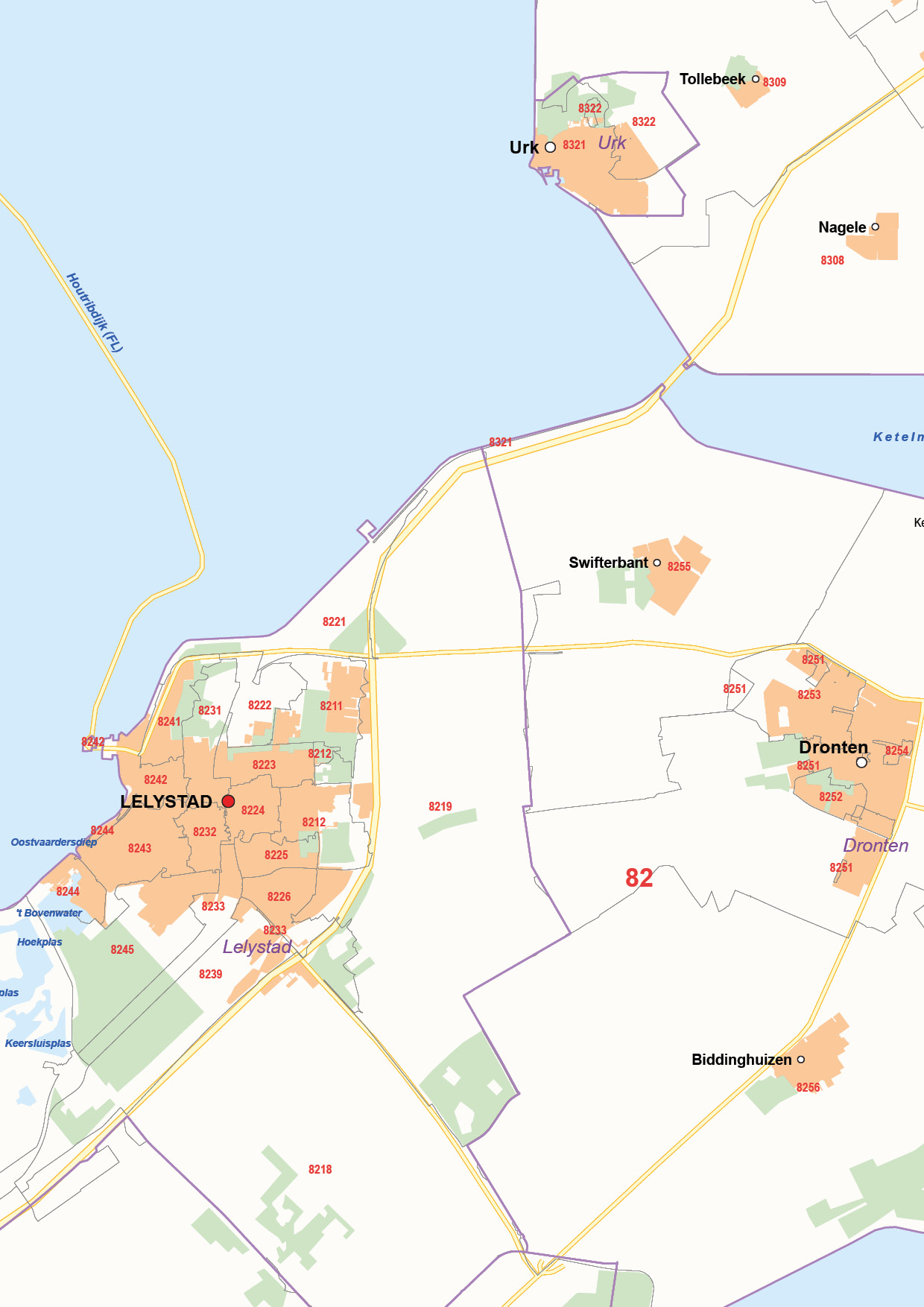 4-cijferige postcode-/gemeentekaart van Flevoland. Duidelijke postcodekaart voor administratieve doeleinden. Geeft naast de postcode- en gemeentegrenzen ook plaatsen, wegen, wateren en grondgebruik weer. Met gemeente indeling 2023.