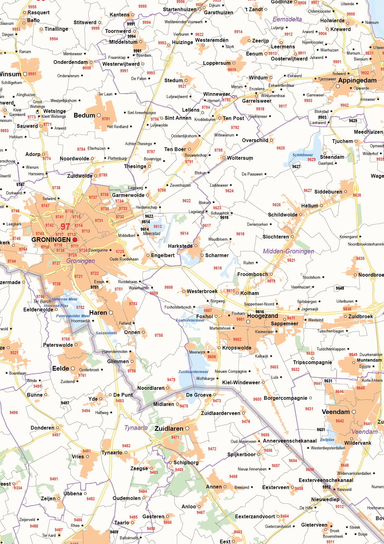 4-cijferige postcode-/gemeentekaart van Groningen. Duidelijke postcodekaart voor administratieve doeleinden. Geeft naast de postcode- en gemeentegrenzen ook plaatsen, wegen, wateren en grondgebruik weer. Een recente kaart met alle wijzigingen tot en met 2021. Daarna geen gemeentelijke herindeling meer in deze provincie.