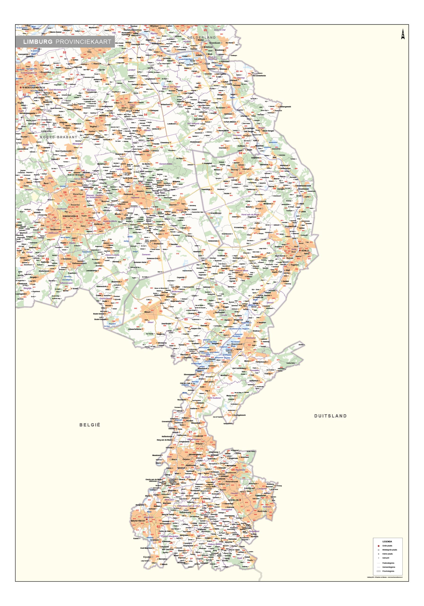 4-cijferige postcode-/gemeentekaart van Limburg. Duidelijke postcodekaart voor administratieve doeleinden. Geeft naast de postcode- en gemeentegrenzen ook plaatsen, wegen, wateren en grondgebruik weer. Met gemeente indeling 2023.