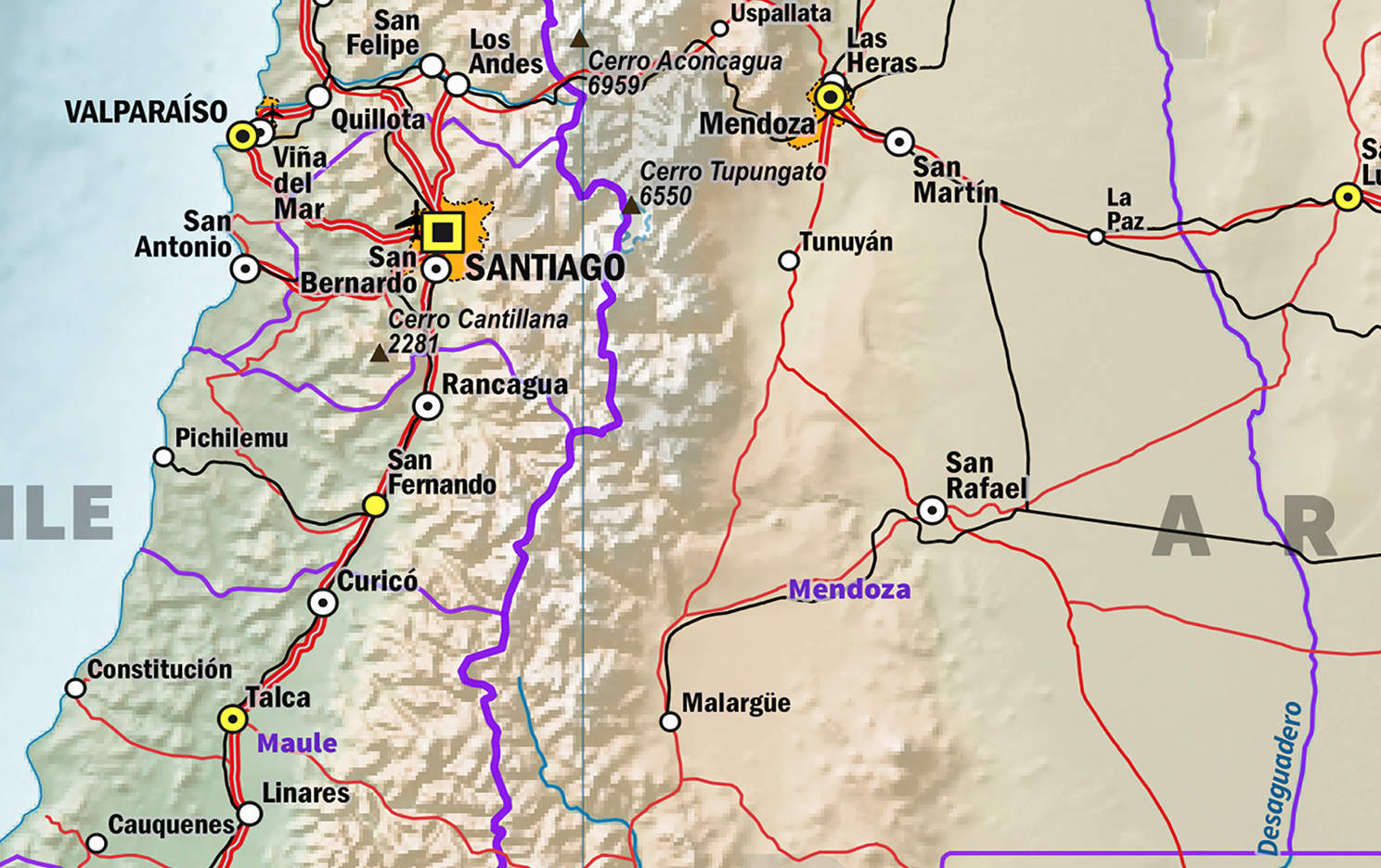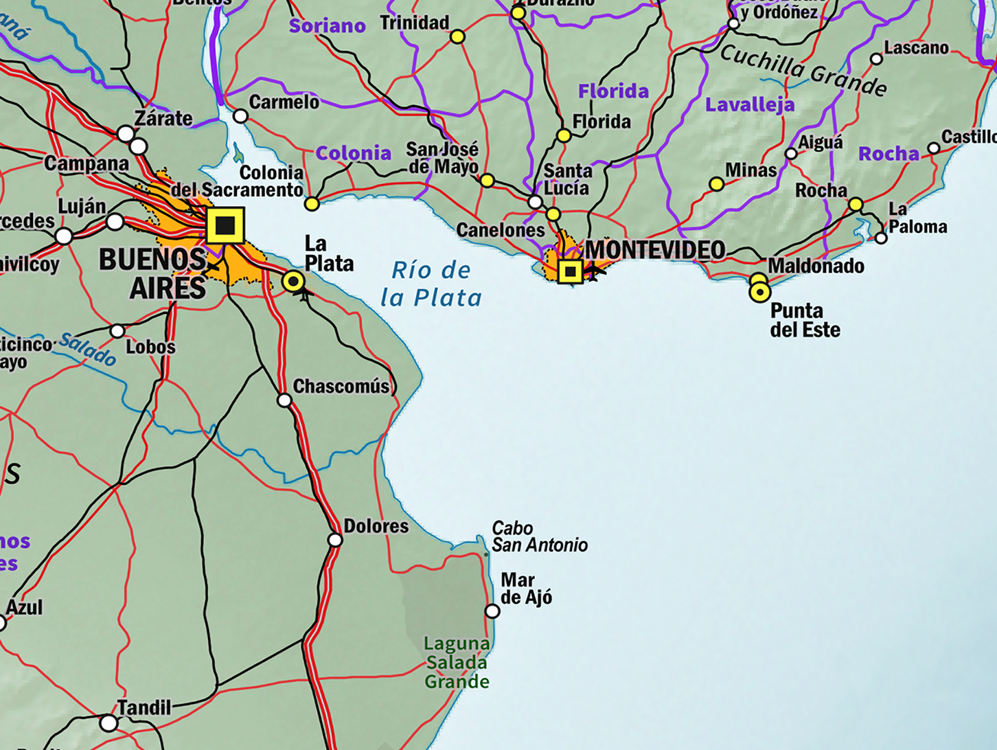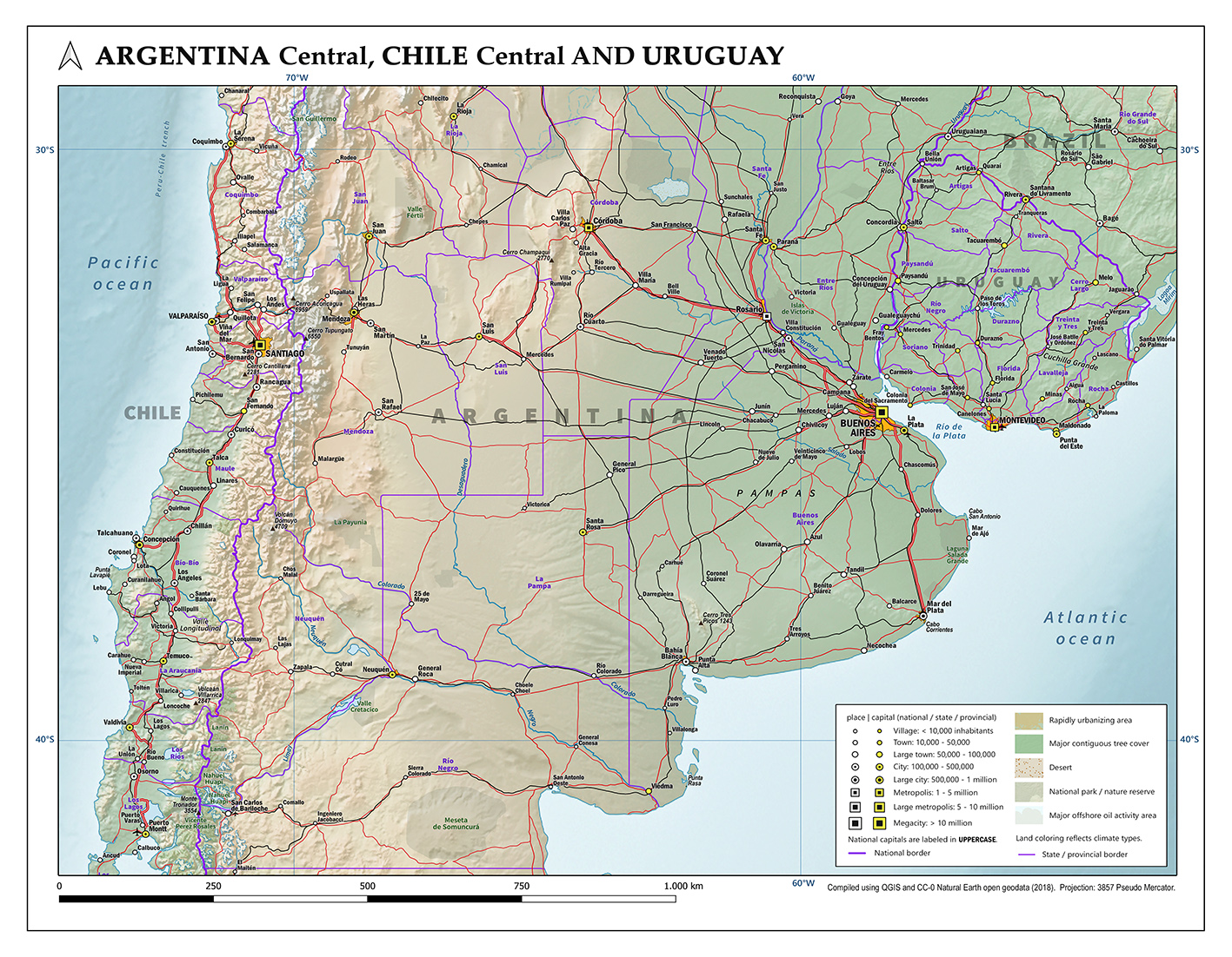 Natuurkundige kaart van centraal Argentinië, centraal Chili en Uruguay. Het reliëf en klimaattypes komen goed naar voren. Regio’s en deelstaten staan op de kaart. De hoofdstad van elke deelstaat is op de kaart geplaatst en daarnaast is er veel informatie over de steden in de legenda beschikbaar. De kaart bevat ook veel andere informatie en is samengesteld uit de Natural Earth open geodata.