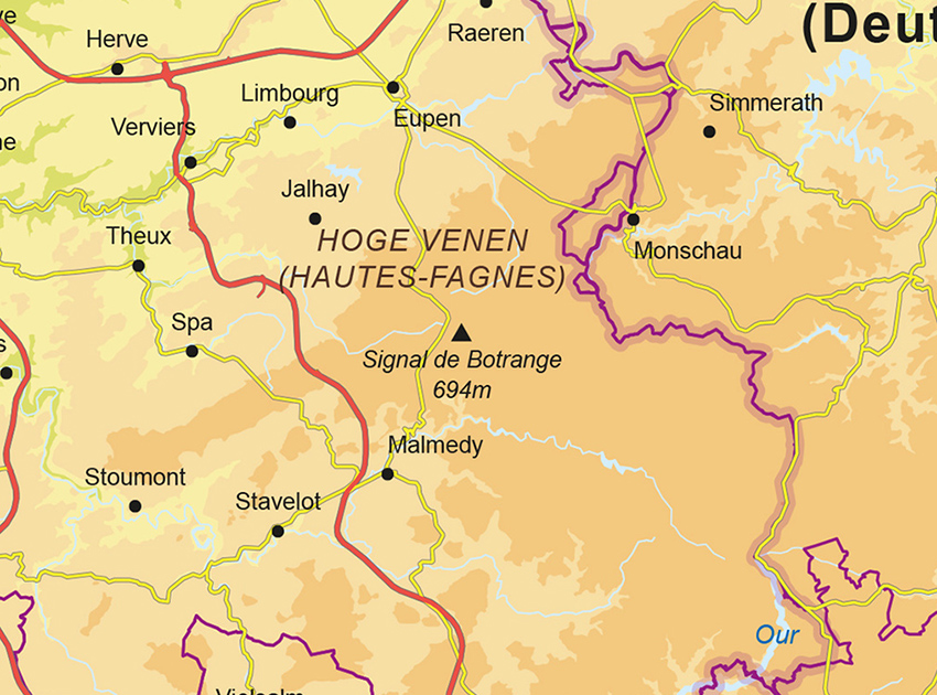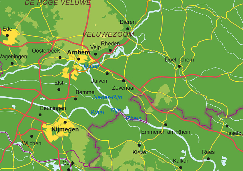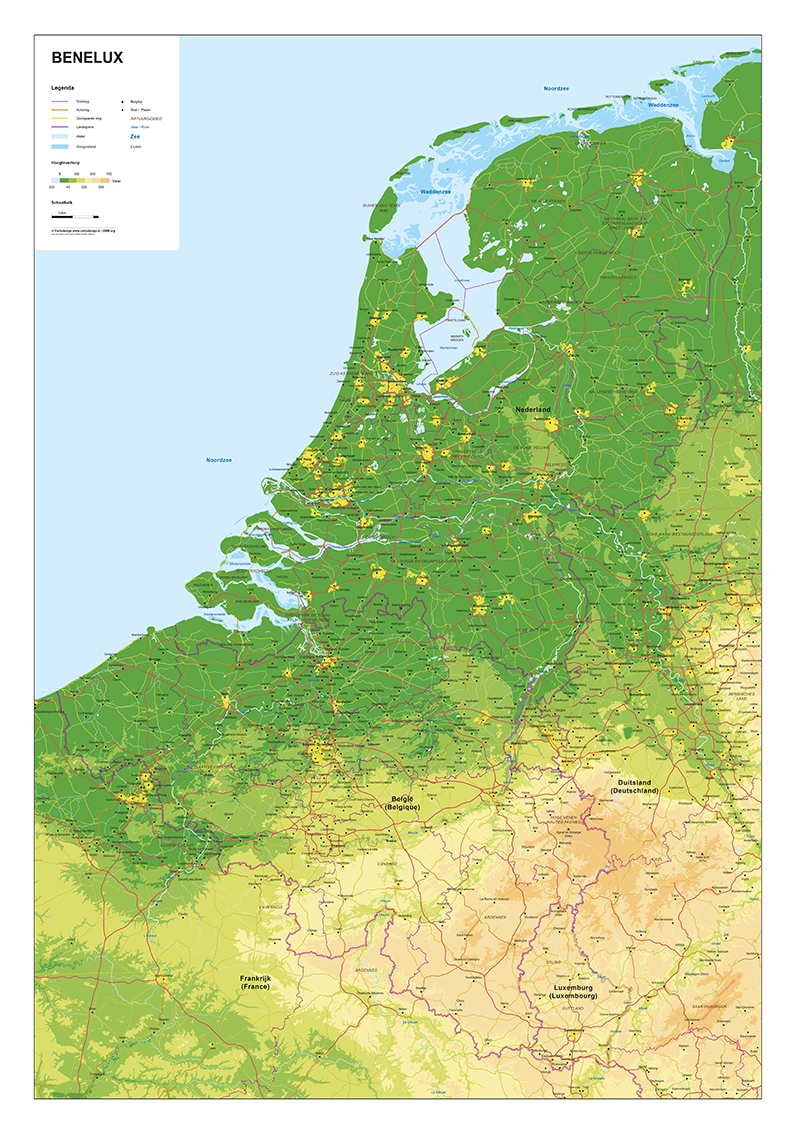 Natuurkundige kaart van de Benelux met veel informatie. Veel steden, dorpen, wegen en wateren staan op de kaart. Alle provincies en provinciegrenzen zijn aangegeven. Bebouwing en hoogtes zijn duidelijk te zien door de kleuren. De kaart is er ook in een staatkundige versie.