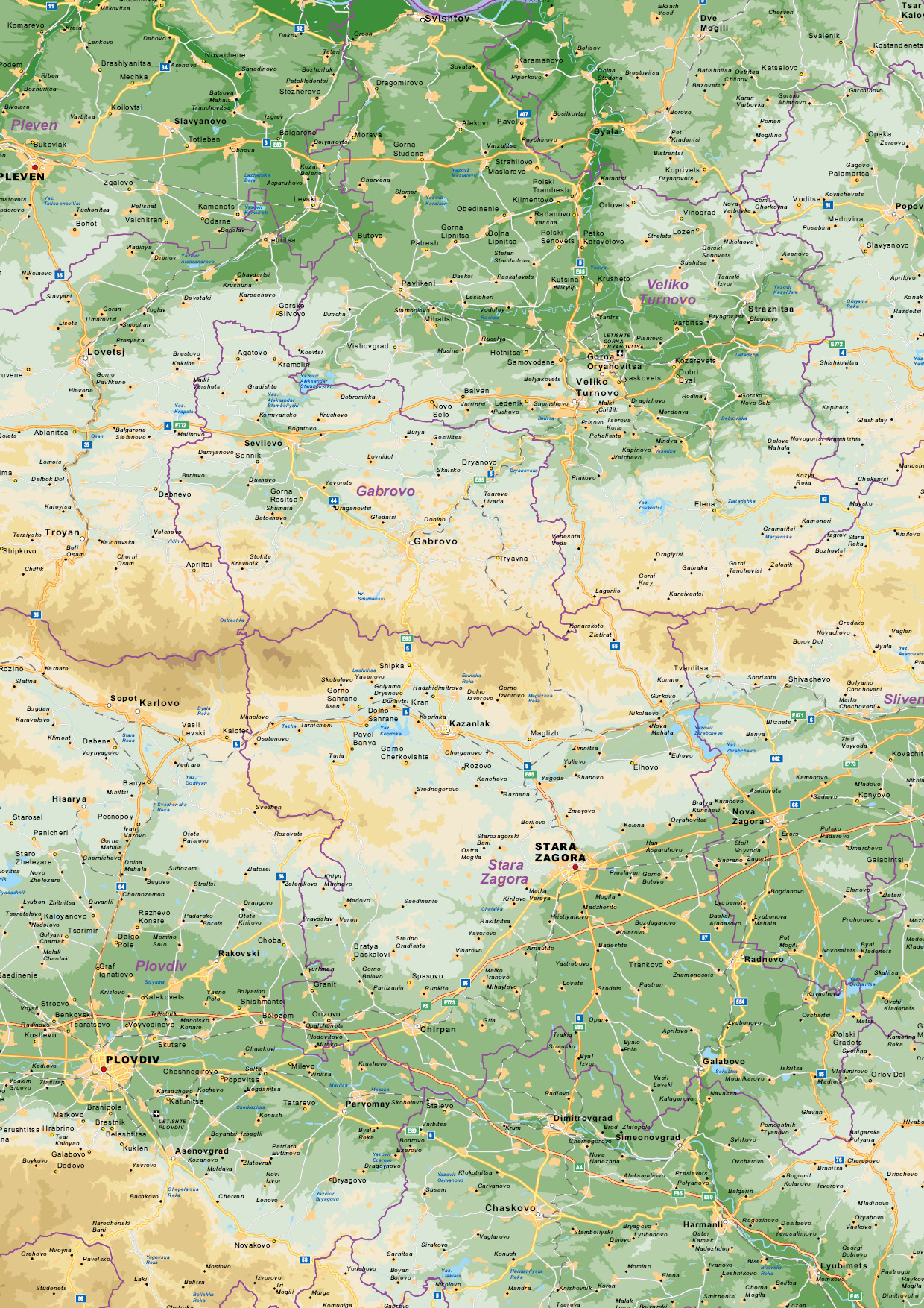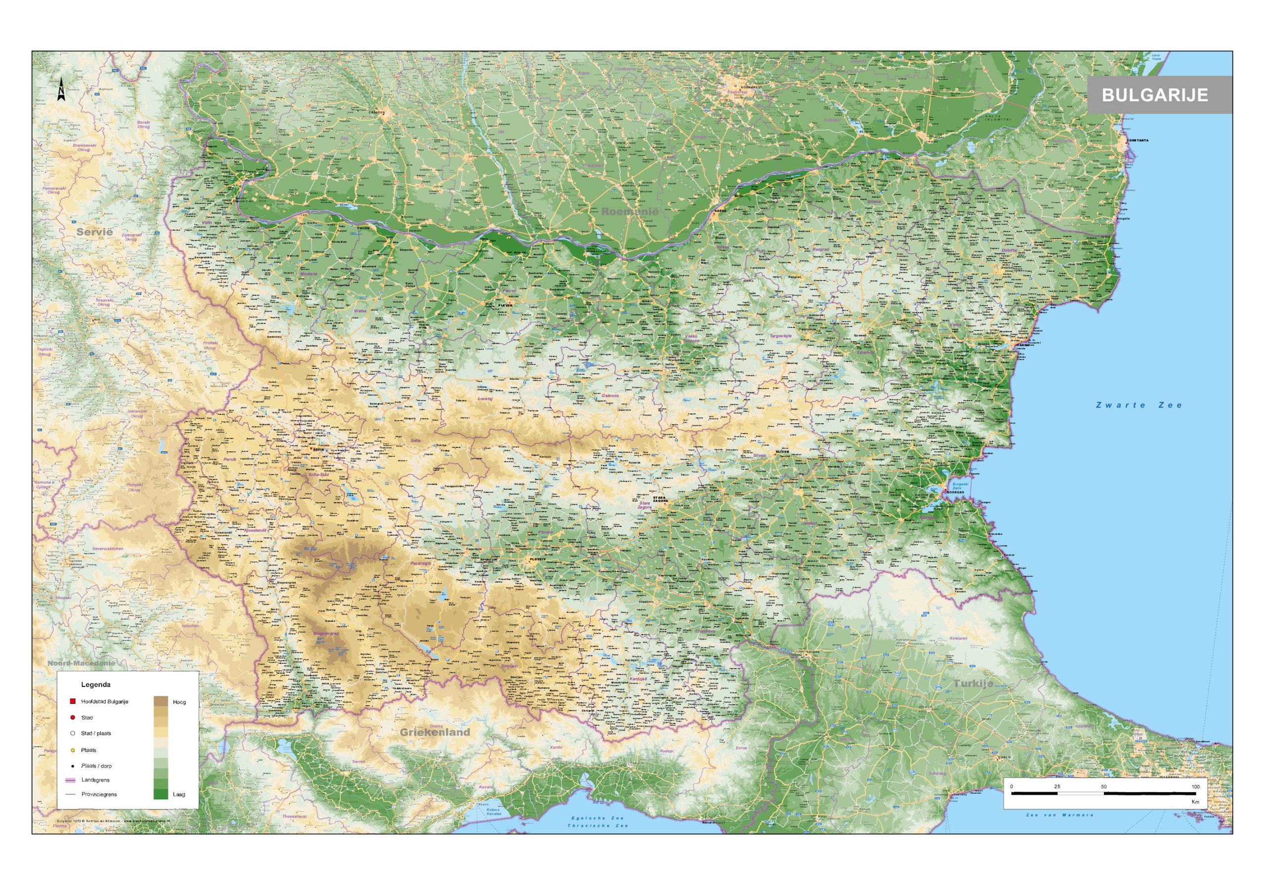 Een duidelijke kaart van Bulgarije met veel steden, grote en kleine plaatsen. Alle provincies staan op de kaart. Door het kleurgebruik zijn de hoogtes duidelijk zichtbaar.