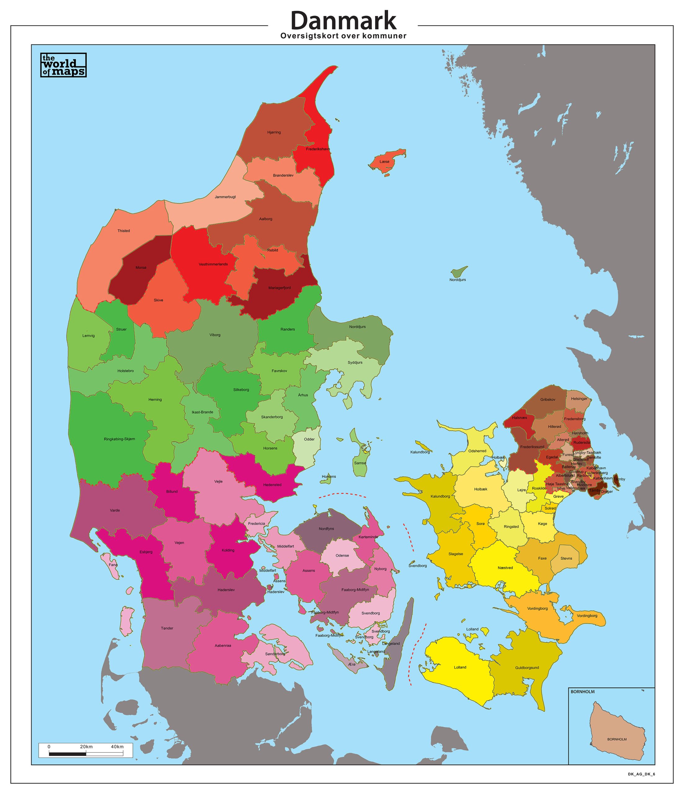 Een gemeente kaart van Denemarken. Toont duidelijk alle gemeenten en provincies. De regio’s worden met kleuren aangegeven. Inclusief alle Deense eilanden. Met schaalbalk.