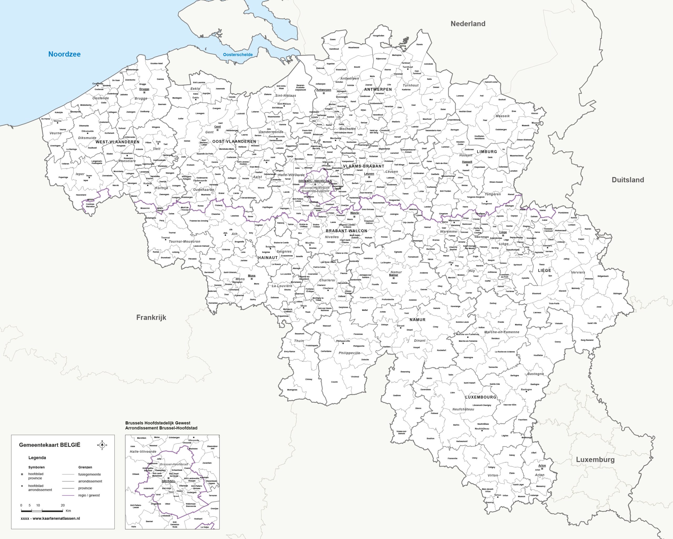 Deze gemeentekaart van België in zwart-wit is helder en overzichtelijk. Alle gemeenten zijn duidelijk ingetekend met hun namen en grenzen, zonder afleiding van kleuren. Dit maakt de kaart bijzonder geschikt voor wie een neutrale en rustige weergave zoekt. Ook is het een perfecte optie om zelf in te kleuren, bijvoorbeeld voor rayon indelingen. De indeling van België in provincies en arrondissementen blijft goed zichtbaar, zonder extra visuele elementen.