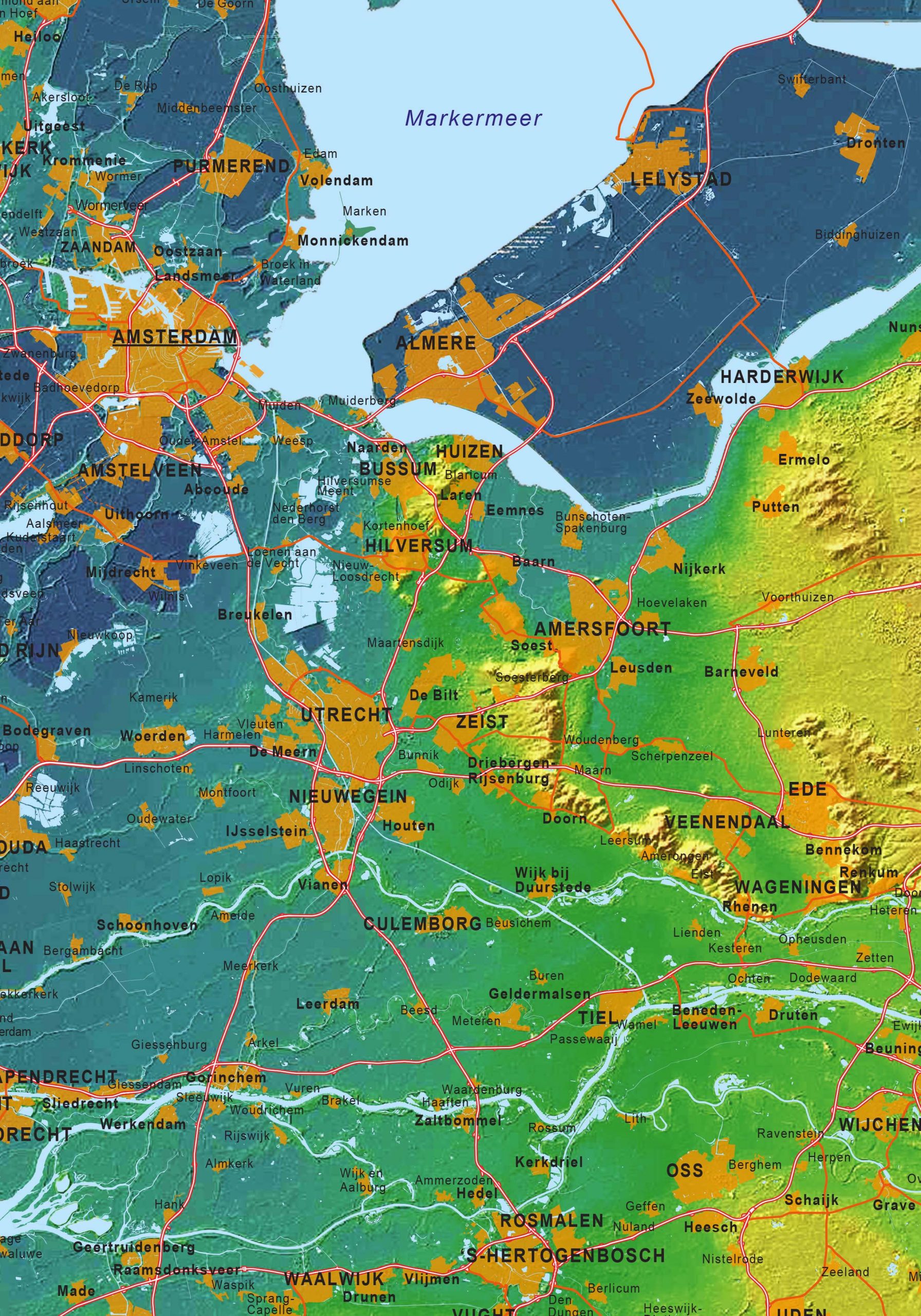Deze kaart van Nederland bevat naast de hoog-/laaginformatie ook de grotere wegen en de 400 grootste steden. De kleuren geven bijna exact het hoogteniveau in Nederland aan. Een zeer fraai vormgegeven kaart. De kaart is geen 3D kaart, de hoogtes worden d.m.v. een shaded reliëf aangegeven.