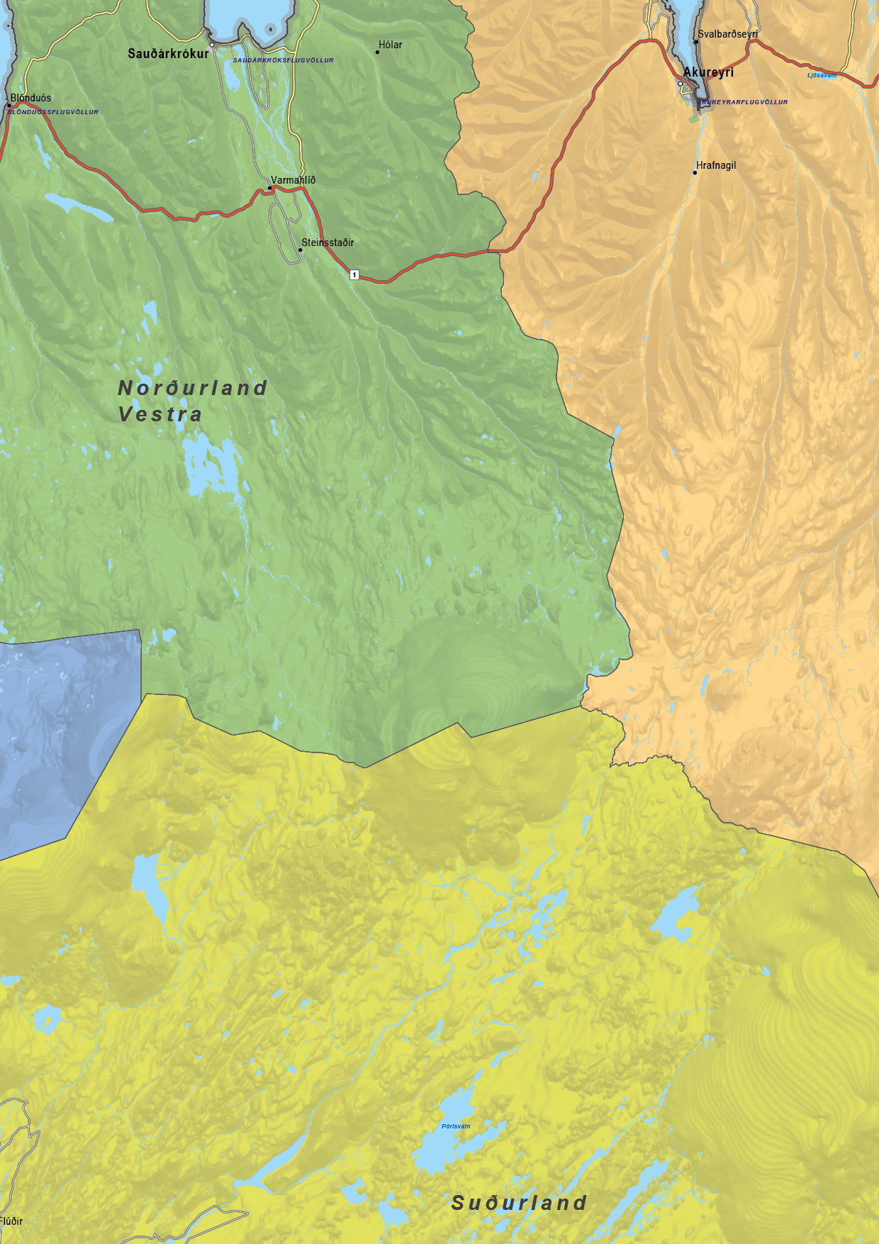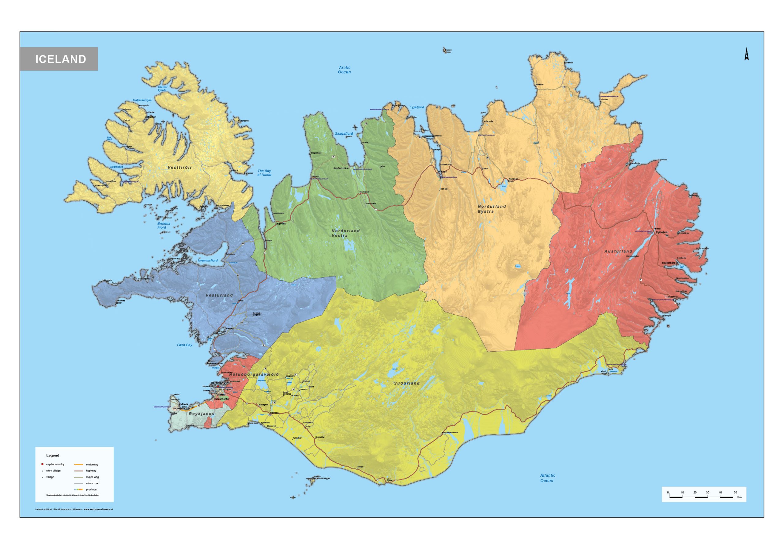 Engelstalige staatkundige kaart van IJsland met veel informatie. Veel steden, dorpen, wegen, spoorwegen en wateren staan op de kaart. De belangrijkste wegennummers zijn genoemd. Alle provincies en provinciegrenzen zijn duidelijk te zien door het kleurgebruik. De kaart is er ook in een natuurkundige versie.
