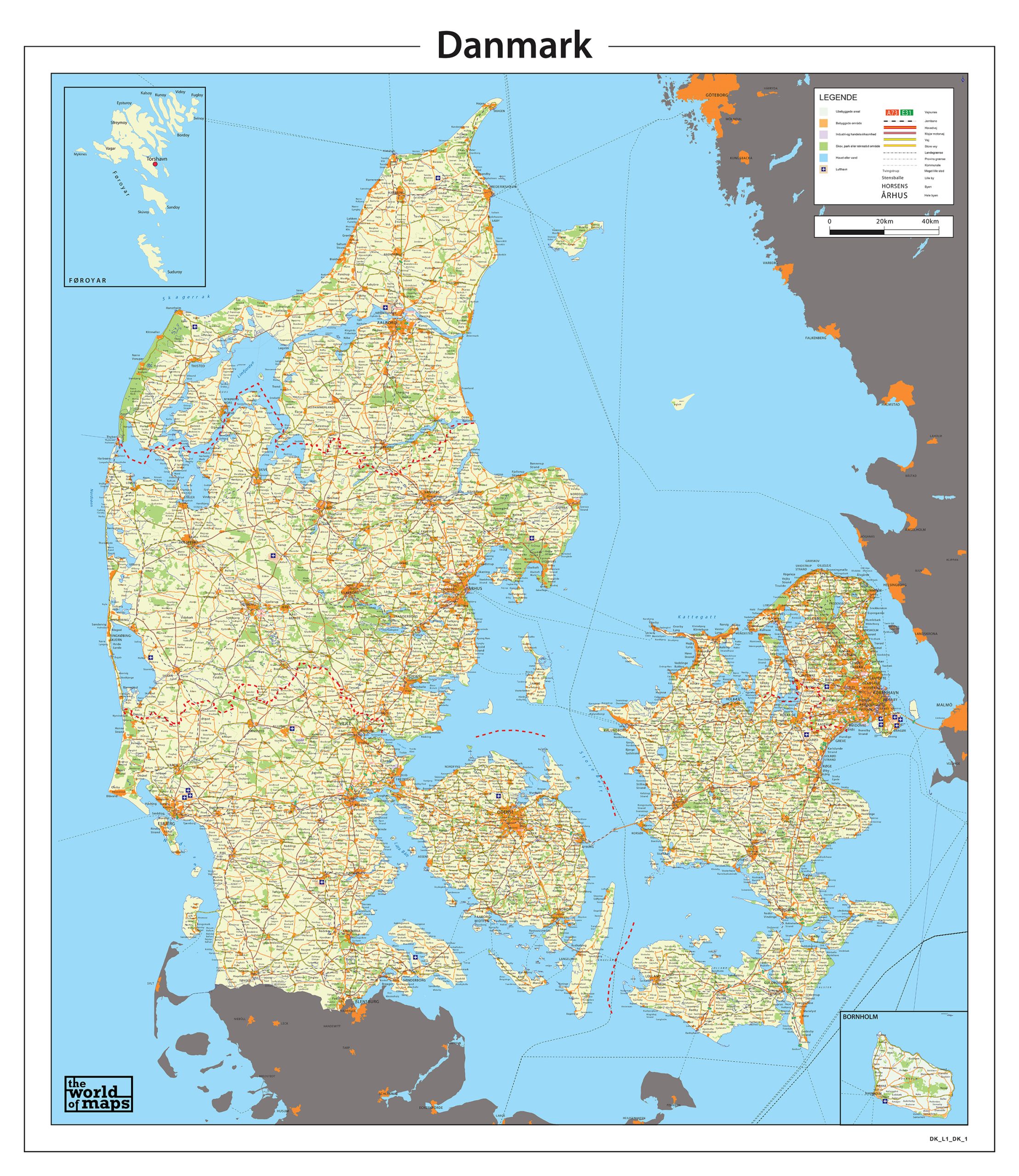 Een gedetailleerde kaart van Denemarken met plaatsnamen van alle steden en dorpen. Alle belangrijkste wegen staan op de kaart. Met mooie topografische ondergrond.