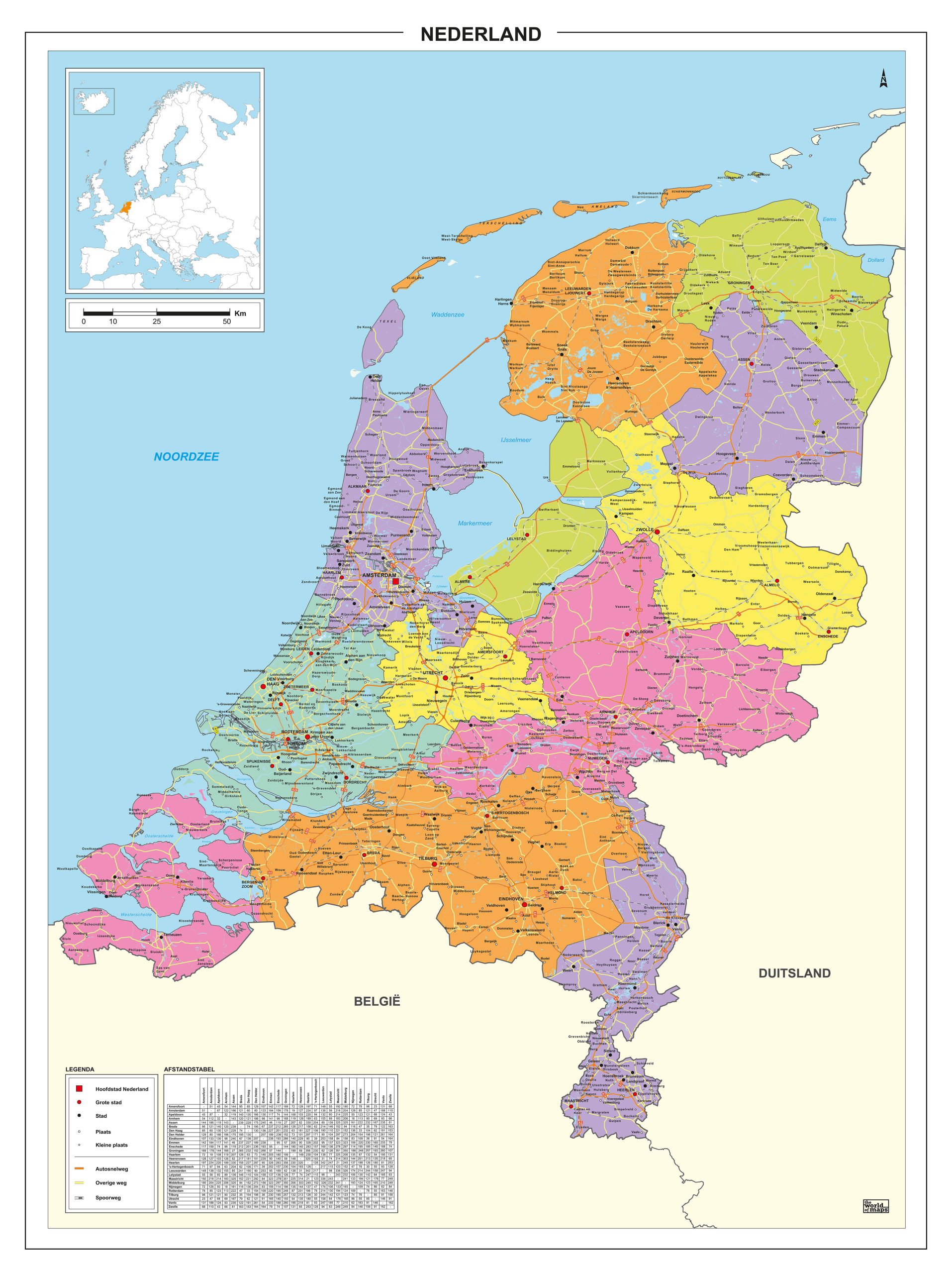 Naast plaatsnamen en provinciegrenzen staan ook alle belangrijke wegen op de kaart. De kaart heeft een legenda en afstandstabel. Ook verkrijgbaar als licht gekleurde landkaart 830.