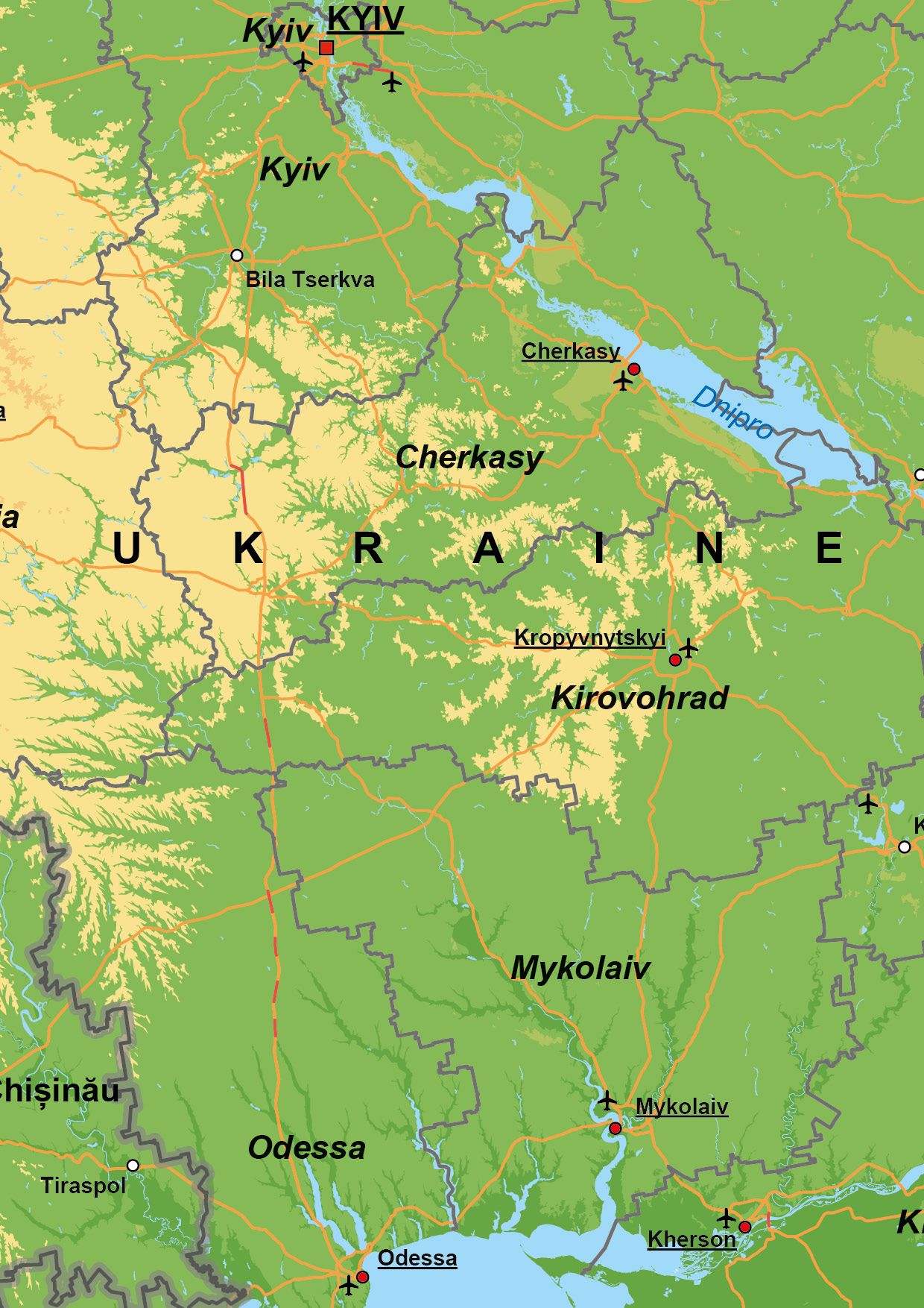 Duidelijke natuurkundige kaart van Oekraïne met Engelse tekst. De grotere steden, wateren en hoofdwegen staan op de kaart. Alle provincies en provinciegrenzen zijn duidelijk afgebeeld. Ook leverbaar als staatkundige kaart.