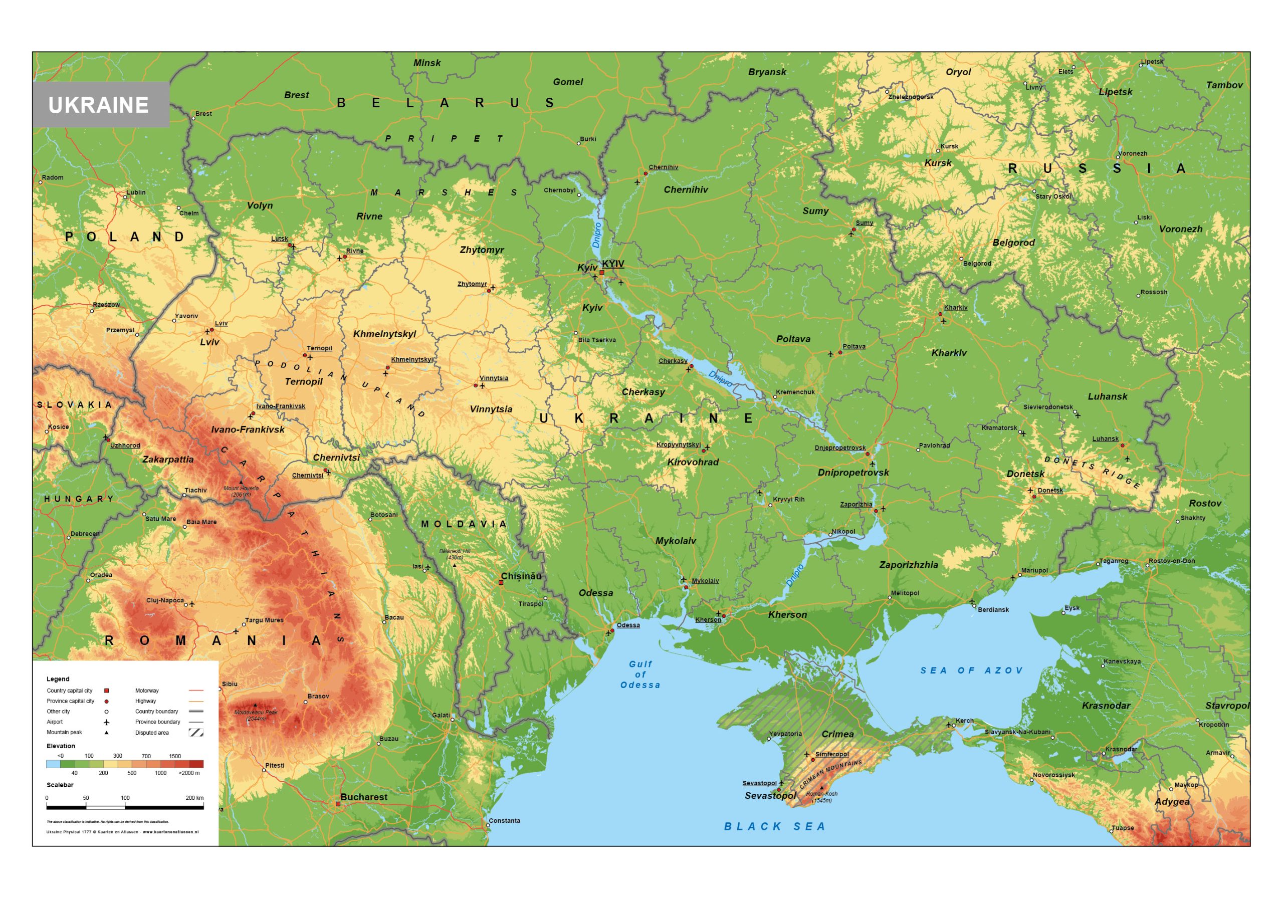 • Engelstalige natuurkundige kaart van Oekraïne
