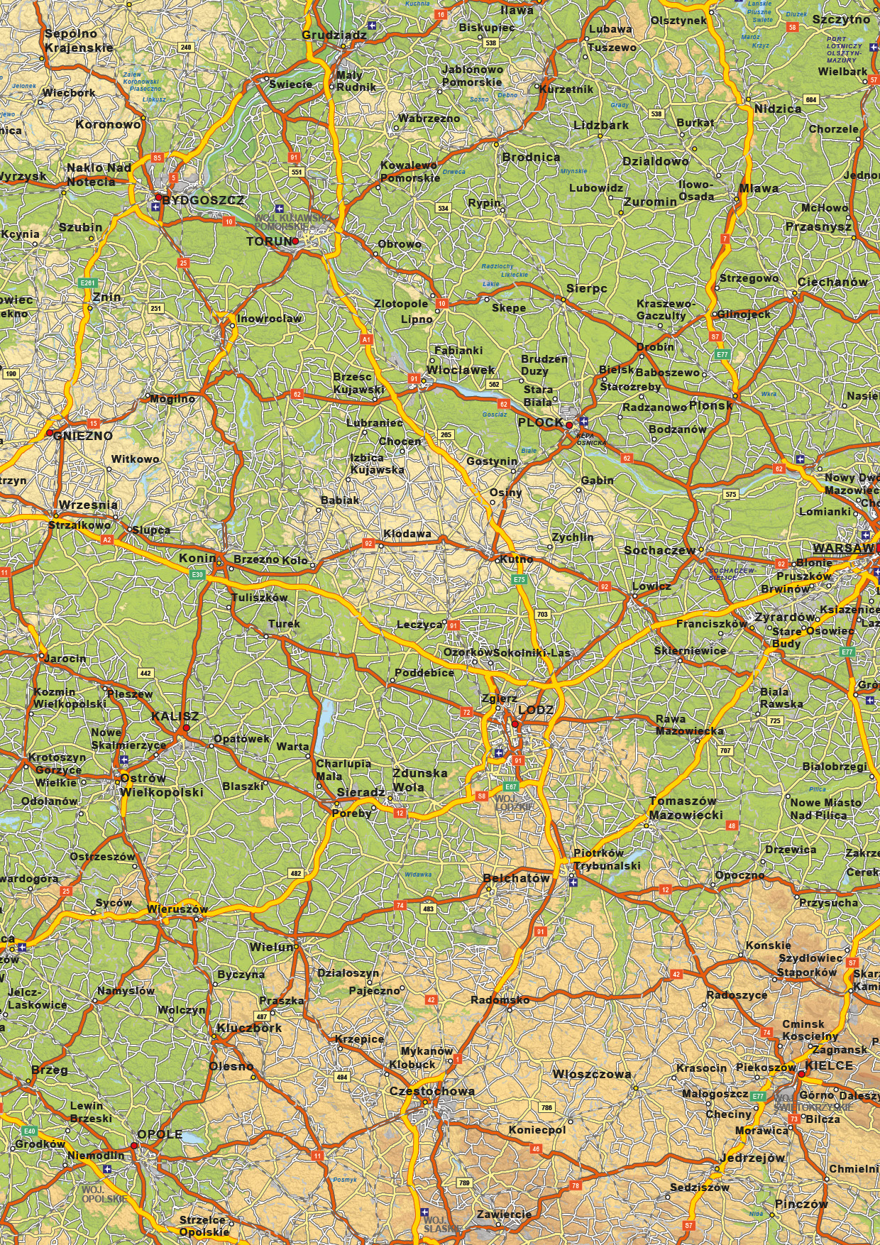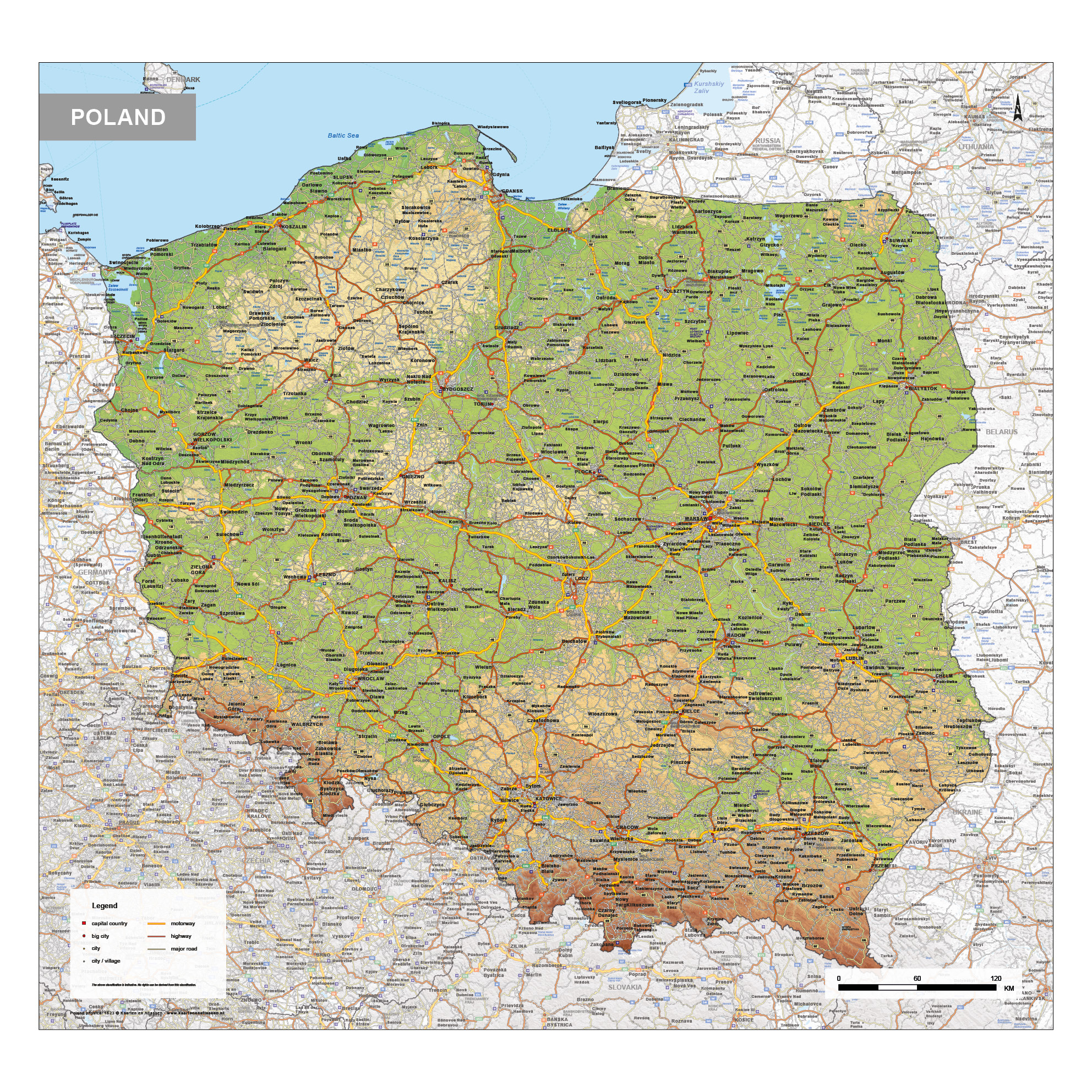 Een duidelijke natuurkundige landkaart van Polen waarop ook de kleinere wegen zijn weergegeven. Alle grote – en middelgrote plaatsen zijn ook op de kaart afgebeeld. De kaart is ook in een staatkundige versie te verkrijgen.
