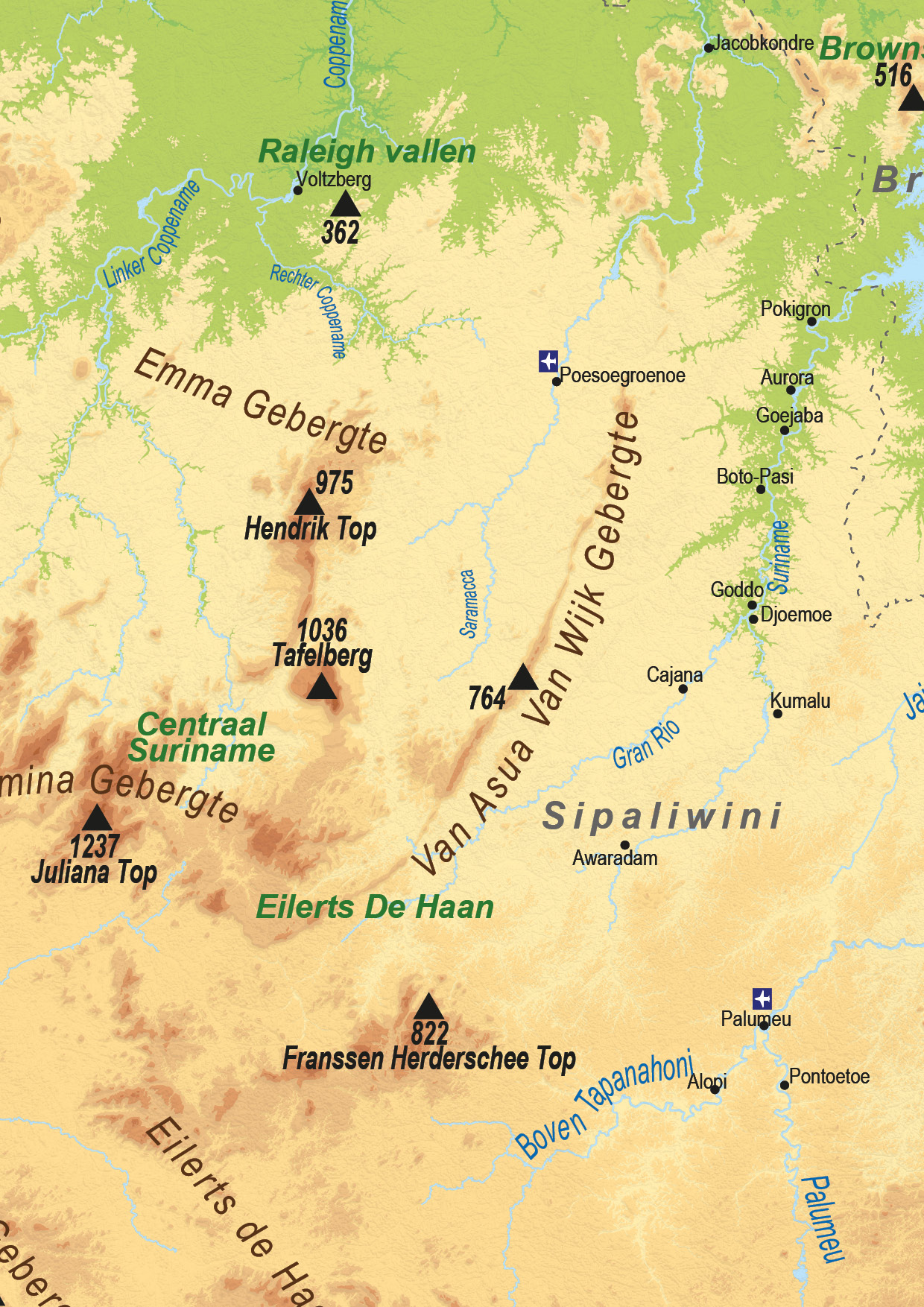 Een duidelijke natuurkundige landkaart van Suriname waarop veel informatie wordt weergegeven. Naast de namen van de grotere plaatsen worden ook veel rivieren met namen weergegeven evenals de namen van de streken. De grotere hoogtes zijn ook genoemd. De kaart heeft een reliëfachtige ondergrond. Het is geen 3D kaart. Ook als staatkundige kaart van Suriname 1700 te bestellen.