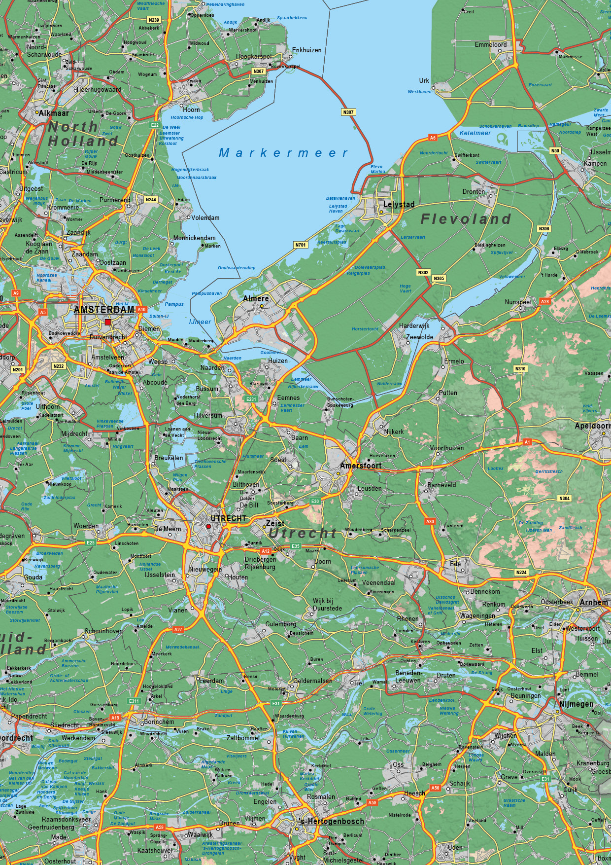 • Veel steden, dorpen, wegen, spoorwegen en wateren