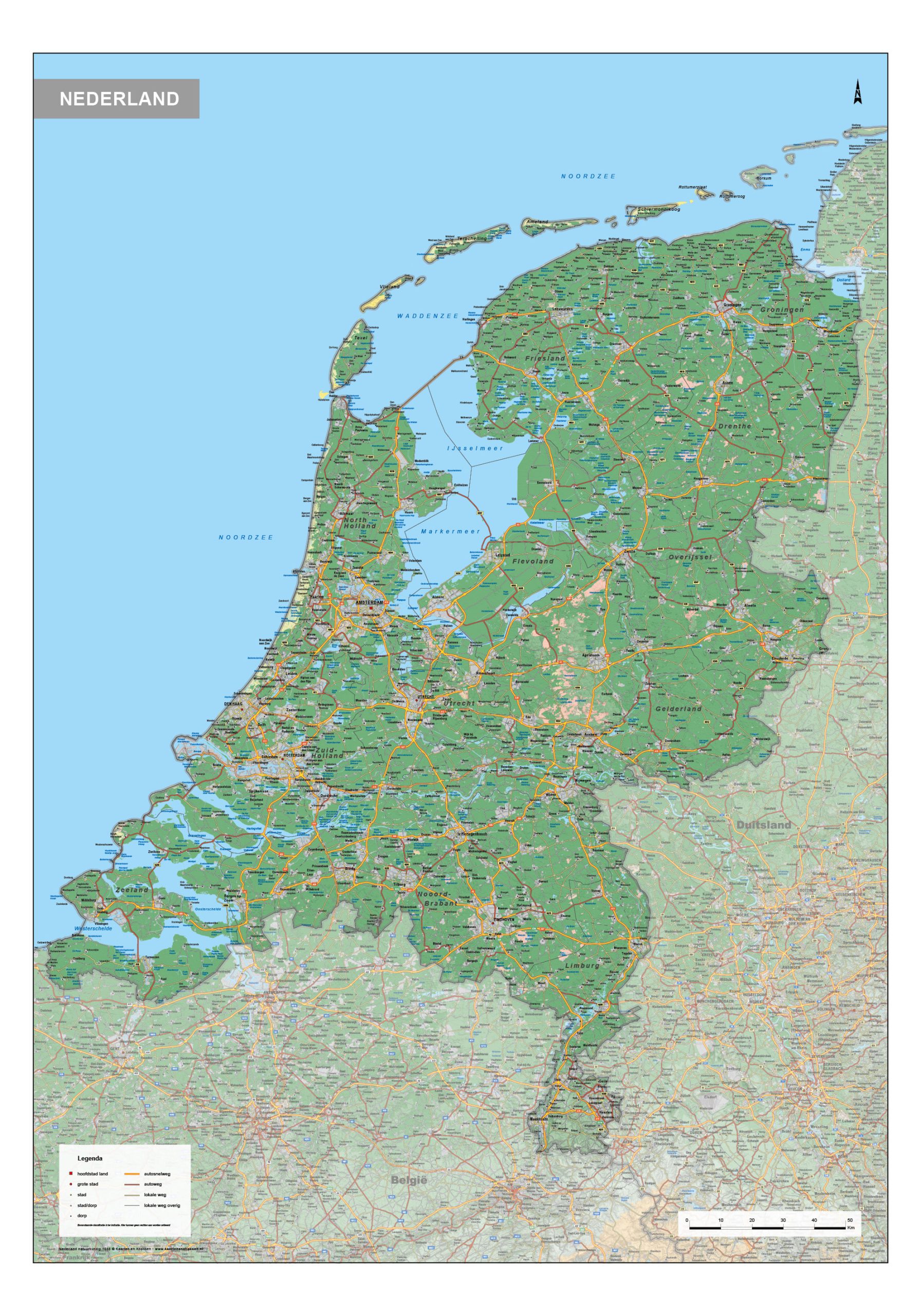 Nederlandstalige natuurkundige kaart van Nederland met veel informatie. Veel steden, dorpen, wegen, spoorwegen en wateren staan op de kaart. De belangrijkste wegennummers zijn genoemd. Alle provincies en provinciegrenzen zijn aangegeven. Bebouwing en grondgebruik zijn duidelijk te zien door de kleuren. De kaart is er ook in een staatkundige versie.