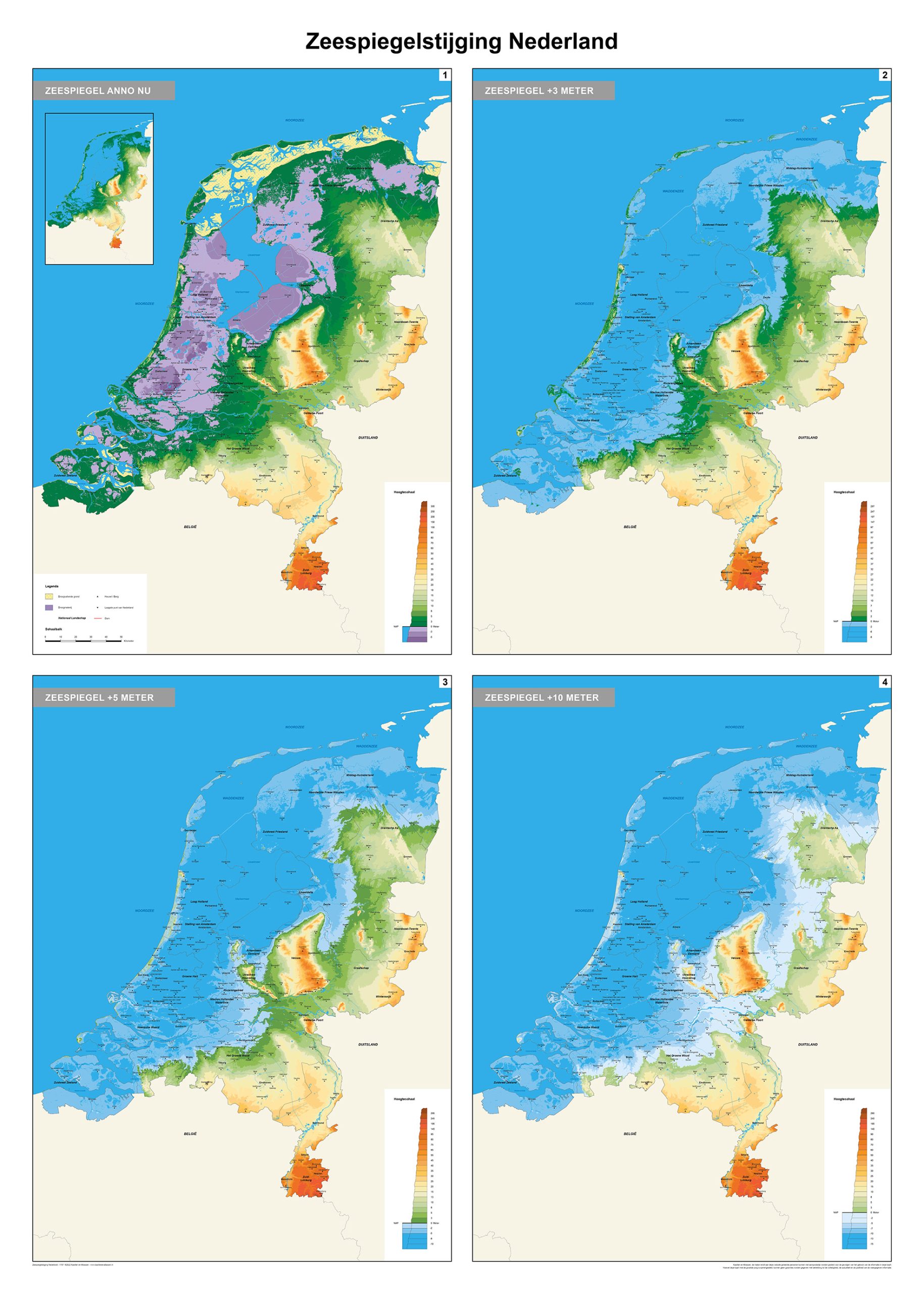 Kaart van Nederland waarop de zeespiegelstijging te zien is. Getoond wordt welke delen van Nederland onder water komen te staan bij 3 meter, 5 meter en 10 meter stijging van de zeespiegel. Er staat een hoogtetabel op de kaart. De 27 kleuren geven een duidelijk overzicht van de verschillende situaties.