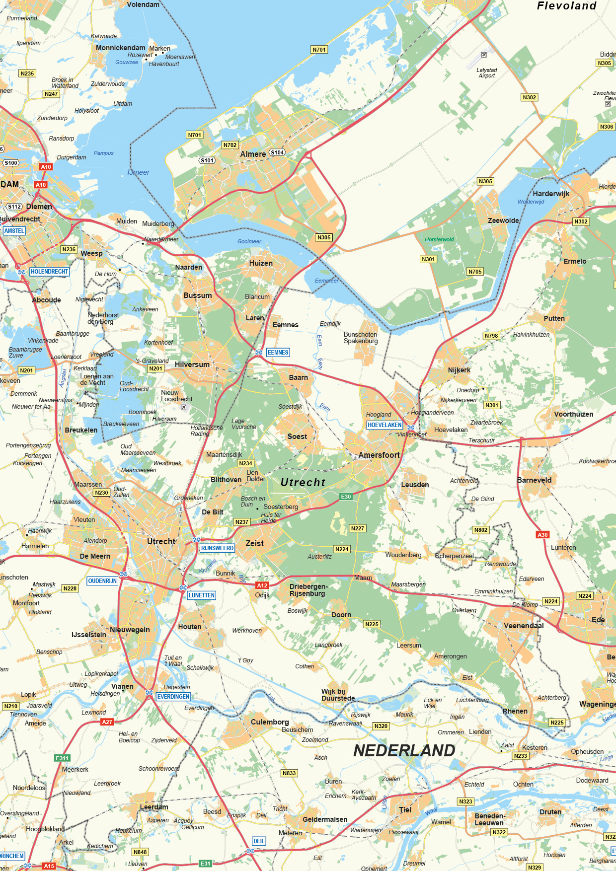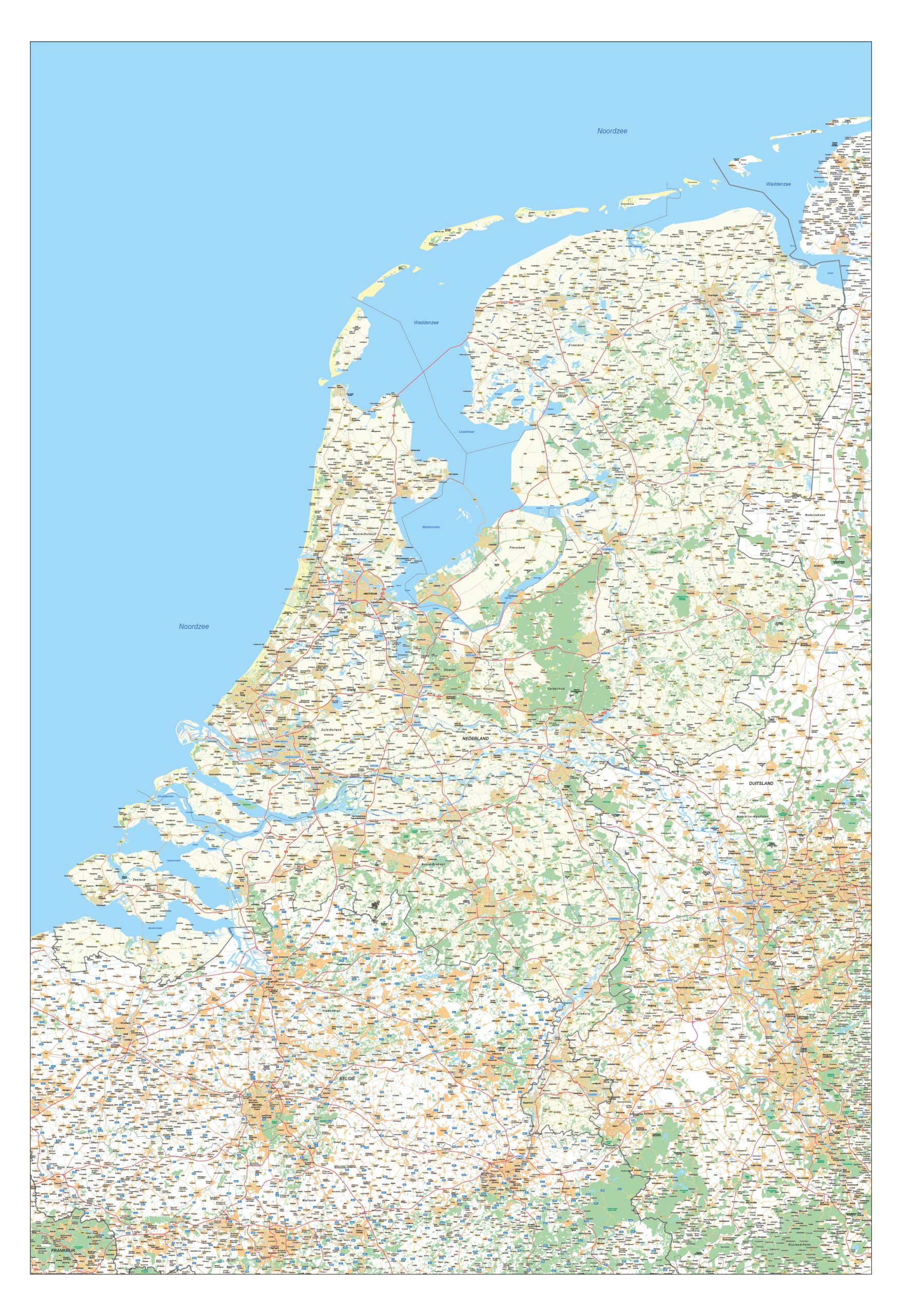 Onze nieuwste wegenkaart van Nederland met heel veel informatie. Plaatsnamen, provinciegrenzen, spoorwegen, snelwegen, N-wegen en knooppunten zijn op de kaart genoemd. Het kaartbeeld komt uit 2022. Door het zeer gedetailleerde detail is de kaart ook geschikt om deelkaarten uit te halen. De kaart kan ook op nog (veel) grotere formaten worden afgedrukt dan hier is aangegeven. Neem hiervoor contact met ons op.