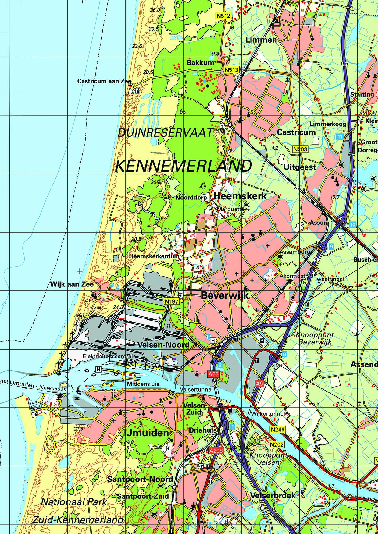 Gedetailleerde kaart van het gebied grenzend aan de Noordzee. Alle plaatsen, buurtschappen, wegen, wateren, spoorlijnen en pontverbindingen zijn afgebeeld.