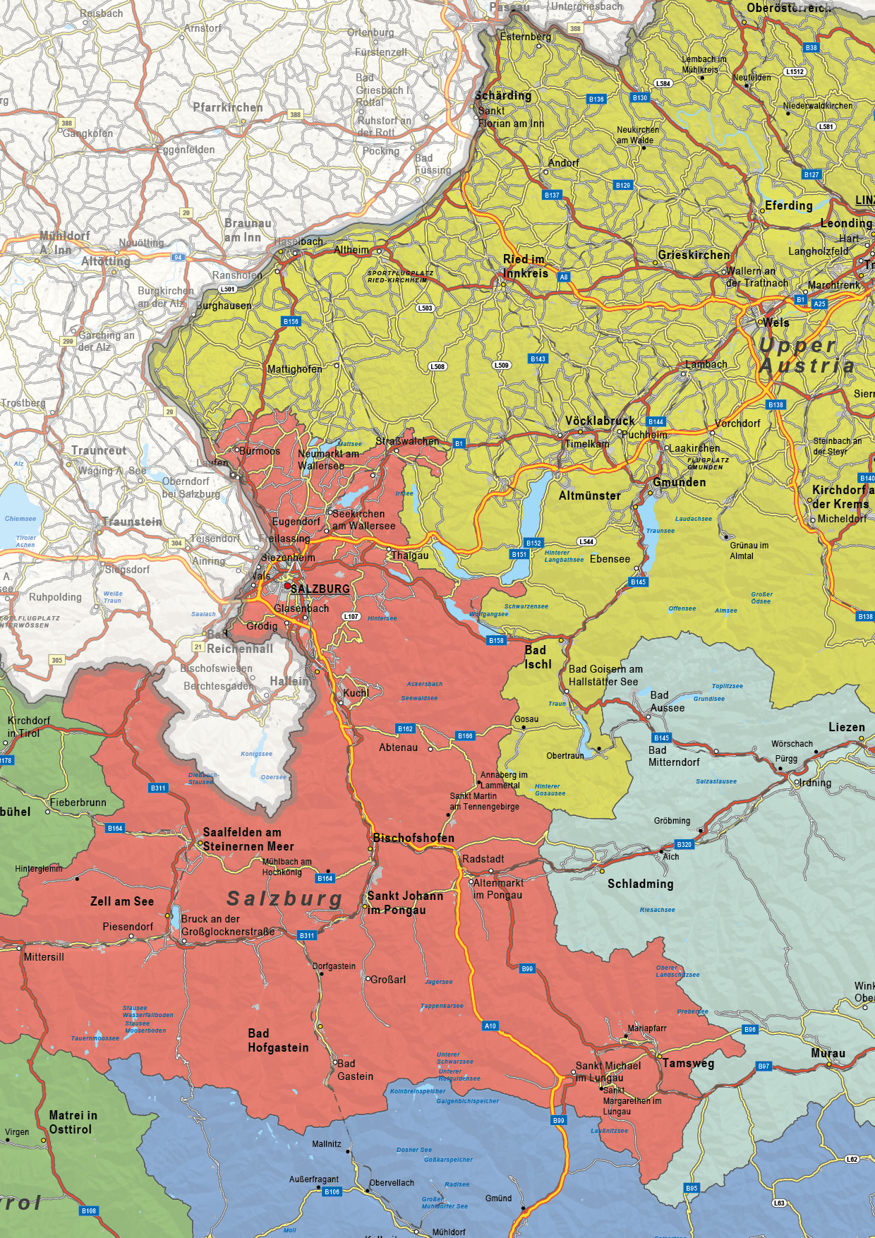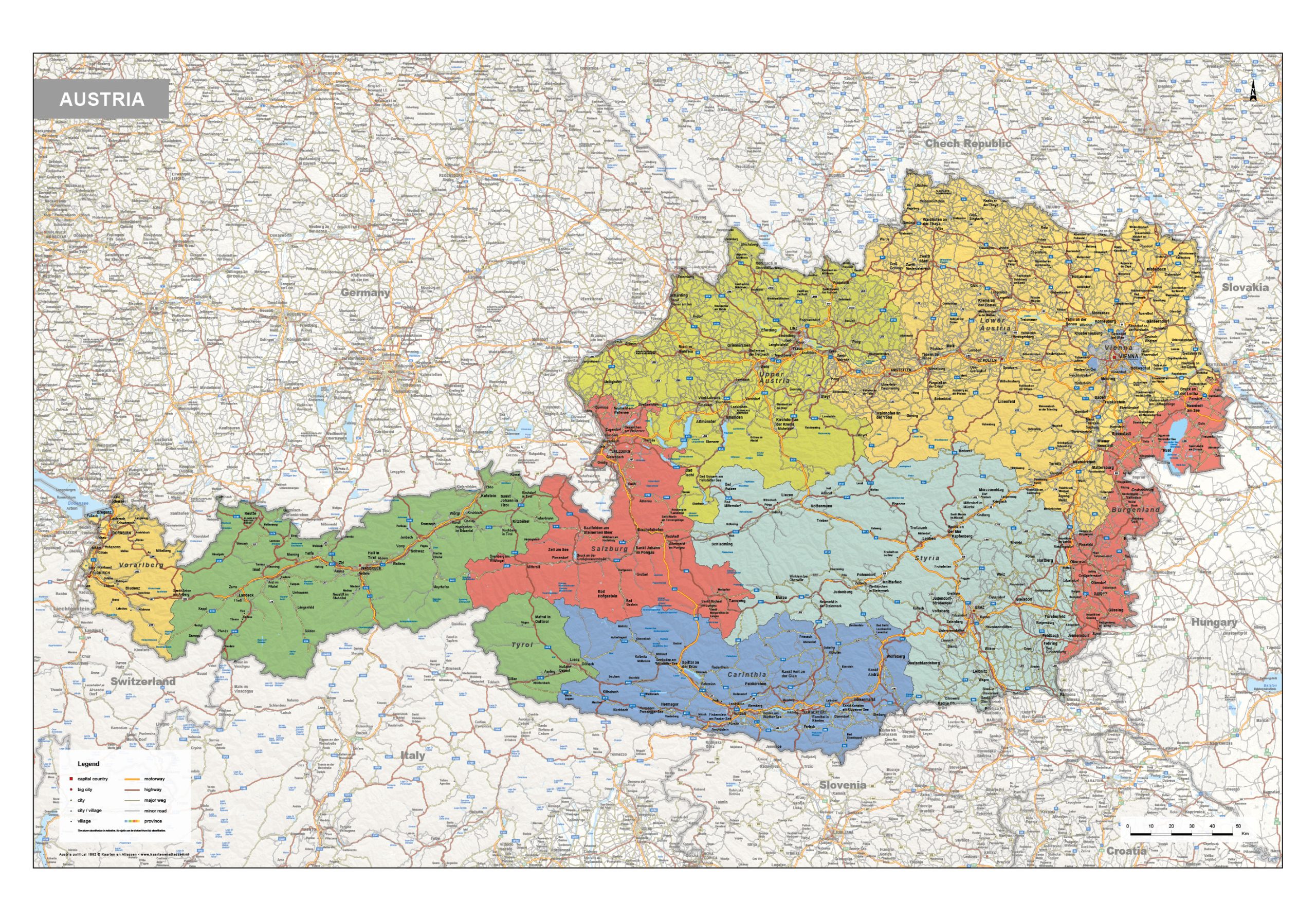 Engelstalige staatkundige kaart van Oostenrijk met veel informatie. Veel steden, dorpen, wegen, spoorwegen en wateren staan op de kaart. De belangrijkste wegennummers zijn genoemd. Alle provincies en provinciegrenzen zijn duidelijk te zien door het kleurgebruik. De kaart is er ook in een natuurkundige versie.